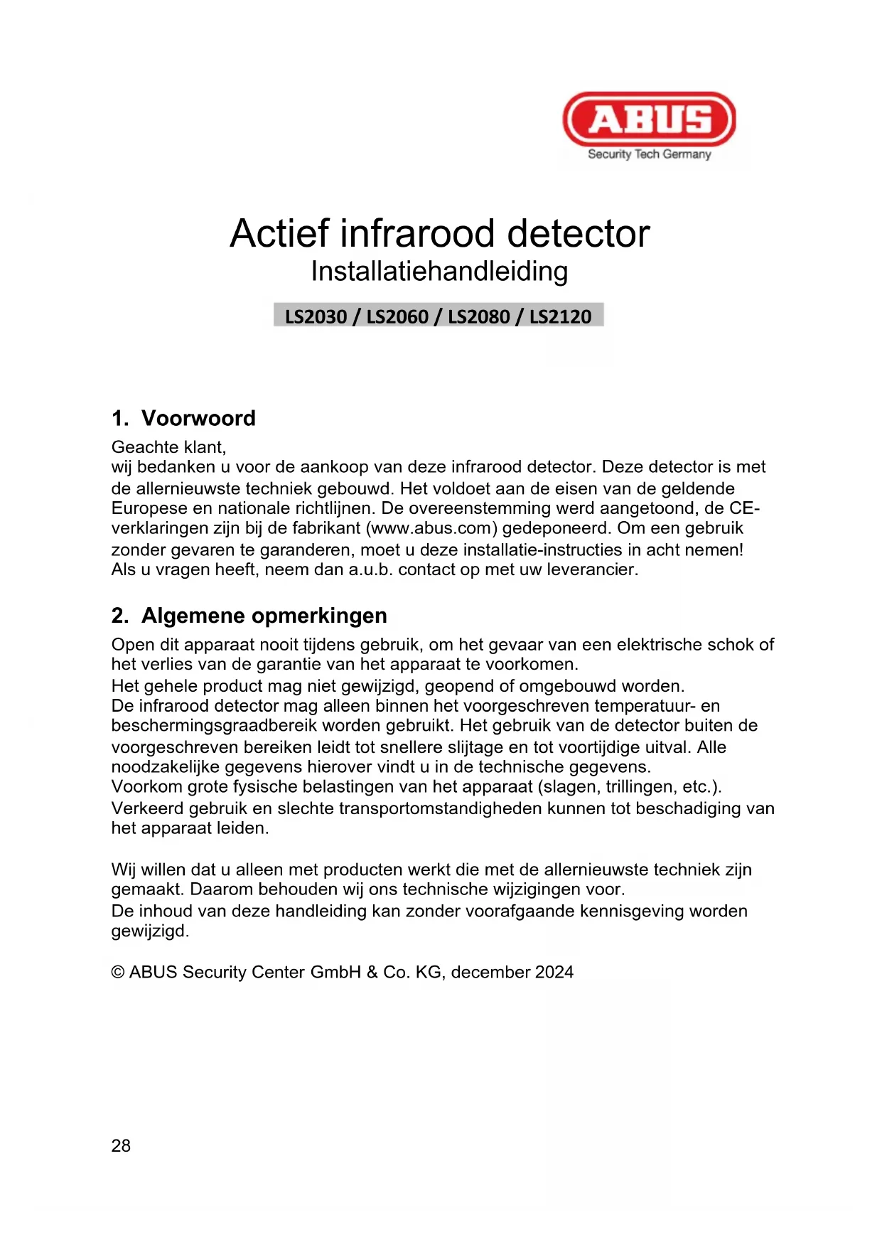 Open dit apparaat nooit tijdens gebruik, om het gevaar van een elektrische schok of het verlies van de garantie van het apparaat te voorkomen. Het gehele product mag niet gewijzigd, geopend of omgebouwd worden. De infrarood detector mag alleen binnen het voorgeschreven temperatuur- en beschermingsgraadbereik worden gebruikt. Het gebruik van de detector buiten de voorgeschreven bereiken leidt tot snellere slijtage en tot voortijdige uitval. Alle noodzakelijke gegevens hierover vindt u in de technische gegevens. Voorkom grote fysische belastingen van het apparaat (slagen, trillingen, etc.). Verkeerd gebruik en slechte transportomstandigheden kunnen tot beschadiging van het apparaat leiden. Wij willen dat u alleen met producten werkt die met de allernieuwste techniek zijn gemaakt. Daarom behouden wij ons technische wijzigingen voor. De inhoud van deze handleiding kan zonder voorafgaande kennisgeving worden gewijzigd. © ABUS Security Center GmbH & Co. KG, december 2024