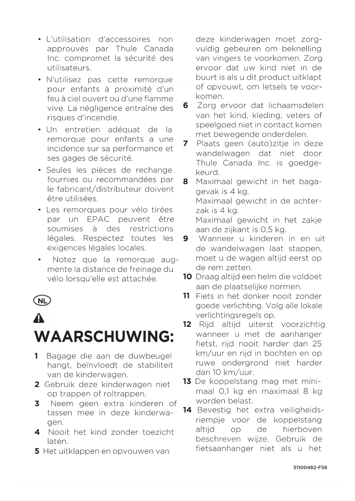 WAARSCHUWING: 1 Bagage die aan de duwbeugel hangt, beïnvloedt de stabiliteit van de kinderwagen. 2 Gebruik deze kinderwagen niet op trappen of roltrappen. 3 Neem geen extra kinderen of tassen mee in deze kinderwa- gen. 4 Nooit het kind zonder toezicht laten. 5 Het uitklappen en opvouwen van deze kinderwagen moet zorg- vuldig gebeuren om beknelling van vingers te voorkomen. Zorg ervoor dat uw kind niet in de buurt is als u dit product uitklapt of opvouwt, om letsels te voor- komen. 6 Zorg ervoor dat lichaamsdelen van het kind, kleding, veters of speelgoed niet in contact komen met bewegende onderdelen. 7 Plaats geen (auto)zitje in deze wandelwagen dat niet door Thule Canada Inc. is goedge- keurd. 8 Maximaal gewicht in het baga- gevak is 4 kg. Maximaal gewicht in de achter- zak is 4 kg. Maximaal gewicht in het zakje aan de zijkant is 0,5 kg. 9 Wanneer u kinderen in en uit de wandelwagen laat stappen, moet u de wagen altijd eerst op de rem zetten. 10 Draag altijd een helm die voldoet aan de plaatselijke normen.