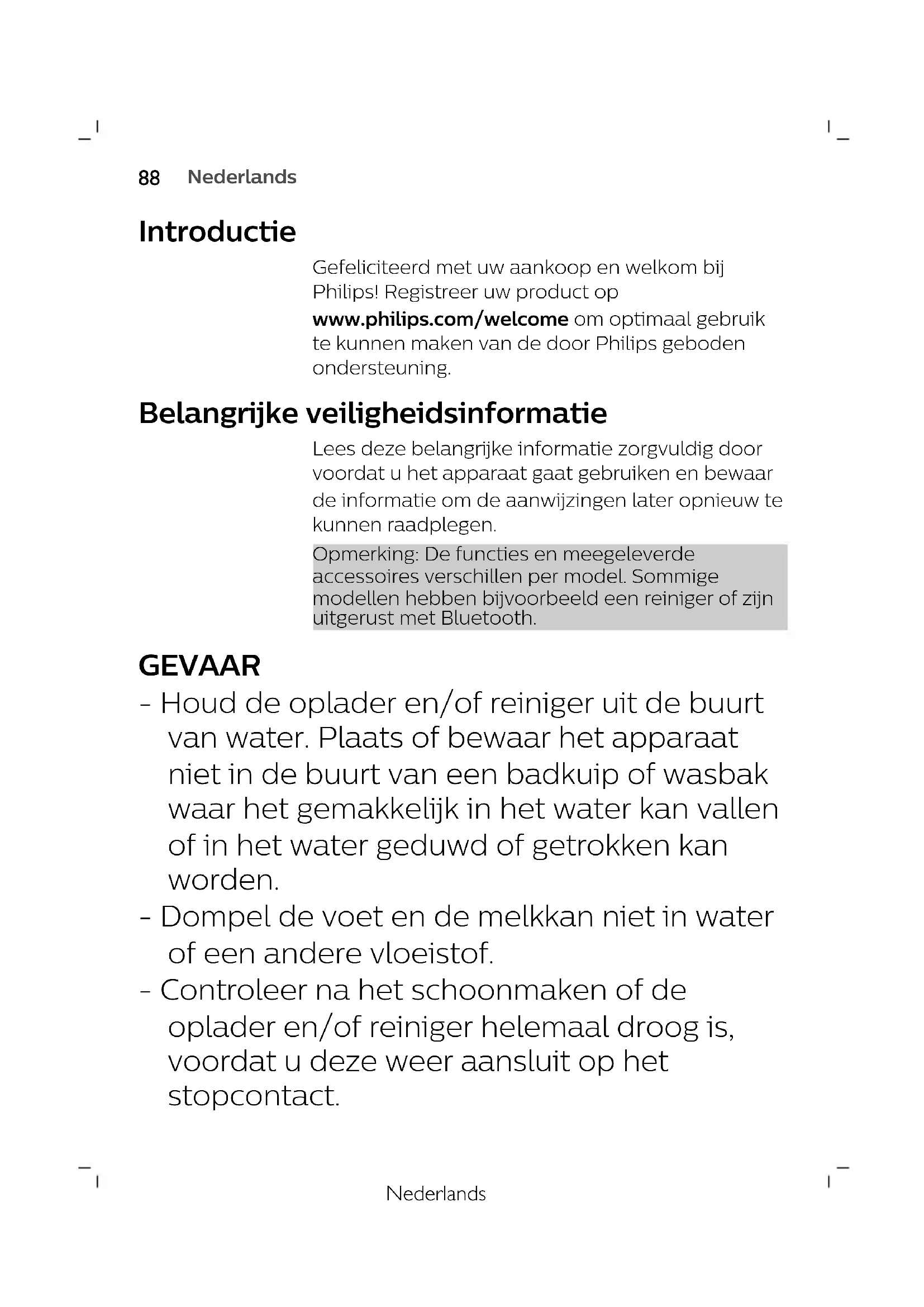 ItalianoNederlands Introductie Gefeliciteerd met uw aankoop en welkom bij Philips! Registreer uw product op www.philips.com/welcome om optimaal gebruik te kunnen maken van de door Philips geboden ondersteuning. Belangrijke veiligheidsinformatie Lees deze belangrijke informatie zorgvuldig door voordat u het apparaat gaat gebruiken en bewaar de informatie om de aanwijzingen later opnieuw te kunnen raadplegen. Opmerking: De functies en meegeleverde accessoires verschillen per model. Sommige modellen hebben bijvoorbeeld een reiniger of zijn uitgerust met Bluetooth. GEVAAR - Houd de oplader en/of reiniger uit de buurt van water. Plaats of bewaar het apparaat niet in de buurt van een badkuip of wasbak waar het gemakkelijk in het water kan vallen of in het water geduwd of getrokken kan worden. - Dompel de voet en de melkkan niet in water of een andere vloeistof. - Controleer na het schoonmaken of de oplader en/of reiniger helemaal droog is, voordat u deze weer aansluit op het stopcontact.
