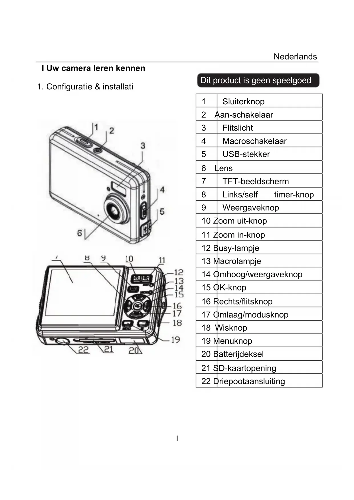 1 Sluiterknop 2 Aan-schakelaar 3 Flitslicht 4 Macroschakelaar 5 USB-stekker 6 Lens 7 TFT-beeldscherm 8 Links/self timer-knop 9 Weergaveknop 10 Zoom uit-knop 11 Zoom in-knop 12 Busy-lampje 13 Macrolampje 14 Omhoog/weergaveknop 15 OK-knop 16 Rechts/flitsknop 17 Omlaag/modusknop 18 Wisknop 19 Menuknop 20 Batterijdeksel 21 SD-kaartopening 22 Driepootaansluiting Dit product is geen speelgoedNederlands