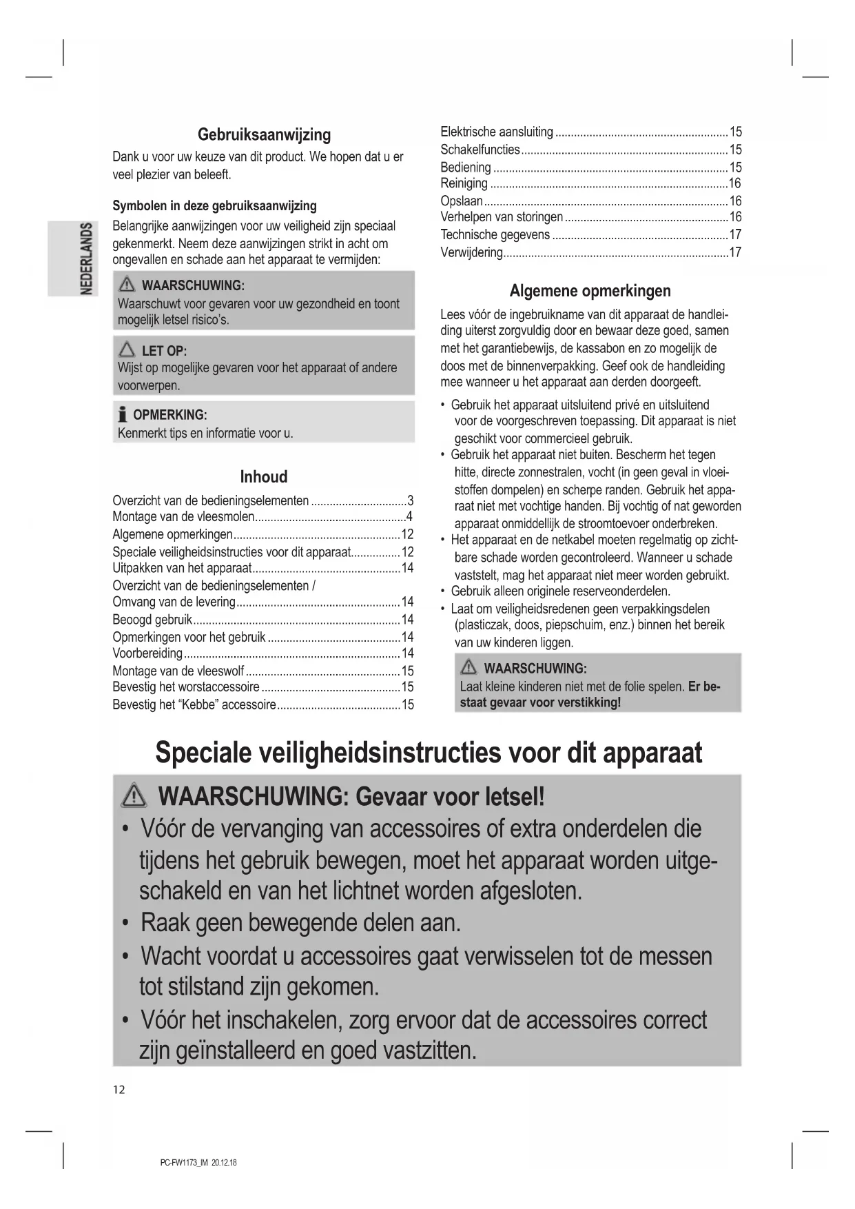 - Gebruik dit apparaat uitsluitend voor het verwerken van voedings- middelen. Misbruik voor andere doeleinden kan tot verwondingen leiden.PC-FW1173_IM 20.12.18