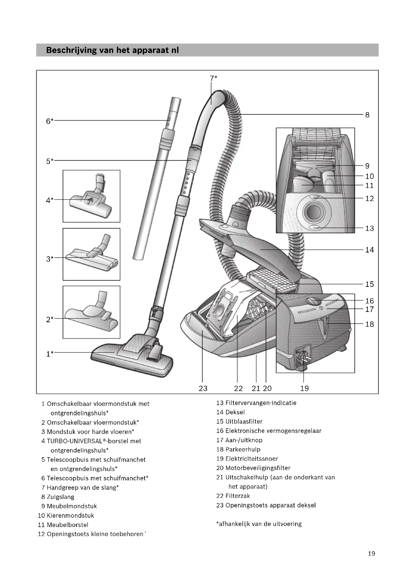 Hoog vermogensbereik: voor het reinigen van zware vloerbedekking, harde vloeren en bij sterke vervuiling. b)Air Turbo: bij zeer sterke vervuiling en grof vuil. Het apparaat zuigt met een maximaal zuigvermogen. Afbeelding Vloermondstuk instellen: a)Voor het zuigen van tapijt en vaste voerbedekking => b)Voor het zuigen van harde vloerbedekking => Let op! Mondstukken zijn, afhankelijk van het type harde vloer (bijv. ruwe vloeren of rustieke plavuizen) onderhevig aan enige slijtage. Daarom dient u de onderkant van het mondstuk regelmatig te controleren. Wanneer de onderkant van het mondstuk versleten is of scherpe randen heeft, kan dit schade veroorzaken aan gevoelige harde vloeren, zoals parket of linoleum. De fabrikant is niet aansprakelijk voor eventuele schade als gevolg van een versleten mondstuk. Turboborstel Wanneer uw apparaat is uitgerust met een turboborstel, vindt u de aanwijzingen voor het gebruik en het onderhoud in de meegeleverde gebruiksaanwijzing. Kleine toebehoren die u niet nodig hebt, kunnen gemakkelijk in het toebehorenvak van het deksel ondergebracht worden. Afbeelding Door op de openingstoets te drukken gaat de deksel van het toebehorenvak automatisch open. Gewenste toebehoren uitnemen. Afbeelding Nadat de toebehoren uitgenomen zijn het deksel van het toebehorenvak sluiten en vastklikken.
