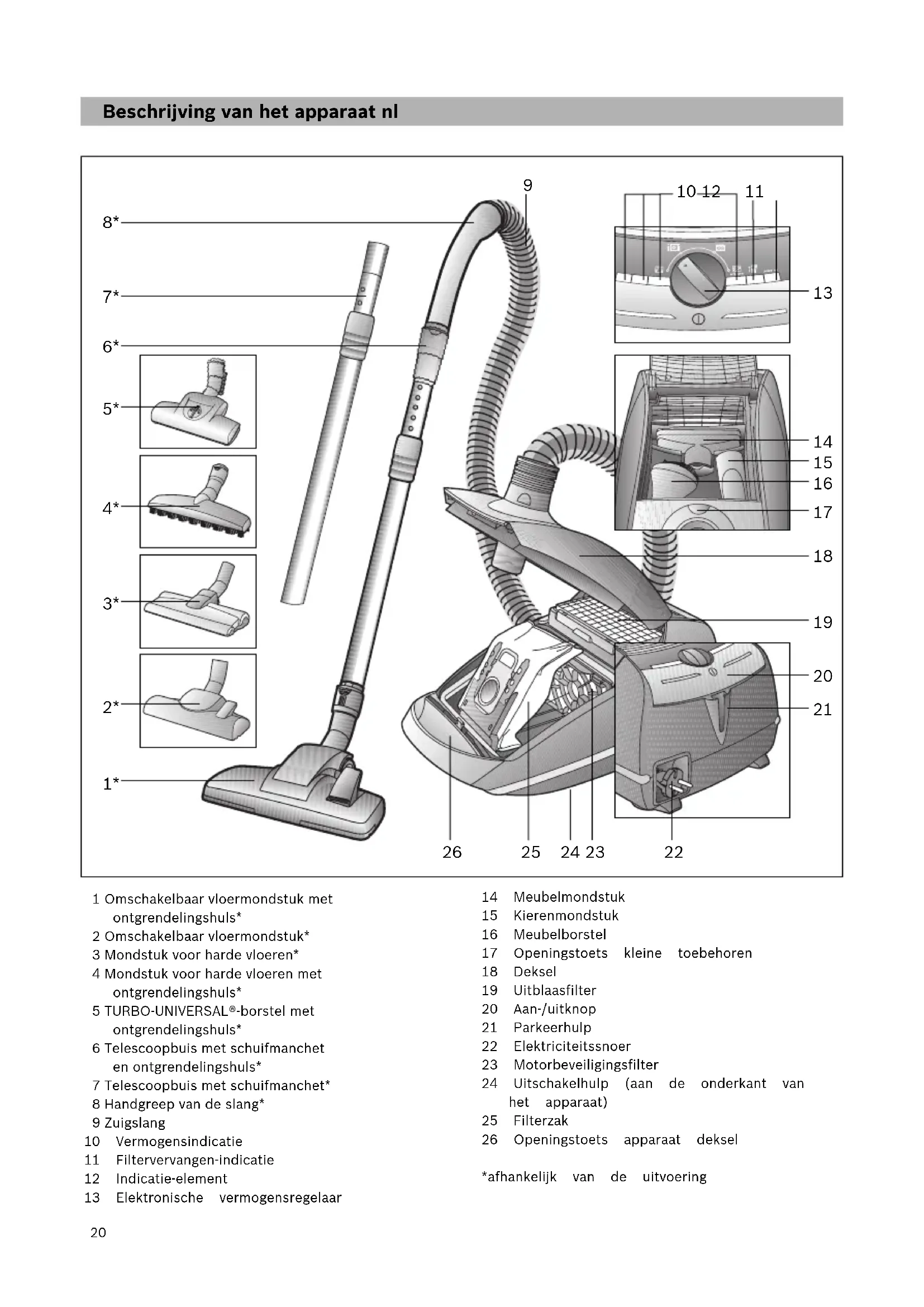 -borstel VZ102TBB Borstelt en zuigt kortpolige tapijten en vaste vloerbedekking, resp. alle vloerbedek- kingen, in één keer. Met name geschikt voor het opzuigen van haren. De rolborstel wordt aangedreven door de zuigstroom van de stofzuiger. Geen elektrische aansluit- ing vereist. Mondstuk voor harde vloeren VZ123HD Voor het zuigen van gladde vloeren (parket, tegels, terracotta,...) Schoonmaakmondstuk VZ103WD Geschikt voor alle harde vloeren, zoals parket, laminaat, houten planken, stenen vloeren, tegels etc. (het effect van vochtige schoonmaakdoekjes op gevoelige harde vloeren moet vooral op een onopvallende plaats gecontroleerd worden). Zuigt grotere vuildeeltjes op, terwijl met de ingeklemde doek tegelijkertijd de bodem vochtig kan worden gereinigd. nl26 Beskrivelse da 1 Universalgulvmundstykke med låsemuffe* 2 Universalgulvmundstykke* 3 Mundstykke til hårde gulvbelægninger* 4 Mundstykke til hårde gulvbelægninger med låsemuffe* 5 TURBO-UNIVERSAL®-børste med låsemuffe* 6 Teleskoprør med skydemanchet og låsemuffe* 7 Teleskoprør med skydemanchet* 8 Håndgreb på sugeslange* 9 Sugeslange 10 Effektindikator 11 Filterskiftsindikator 12 Indikatorelement 13 Elektronisk effektregulator 14 Polstermundstykke 15 Fugemundstykke 16 Møbelpensel 17 Åbneknap, tilbehørsrum 18 Låg 19 Udblæsningsfilter 20 Tænd-/sluk-kontakt 21 Parkeringssystem 22 Nettilslutningsledning 23 Motorbeskyttelsesfilter 24 Parkeringssystem (på apparatets underside) 25 Filterpose 26 Åbneknap, apparatlåg *afhængigt af udstyr