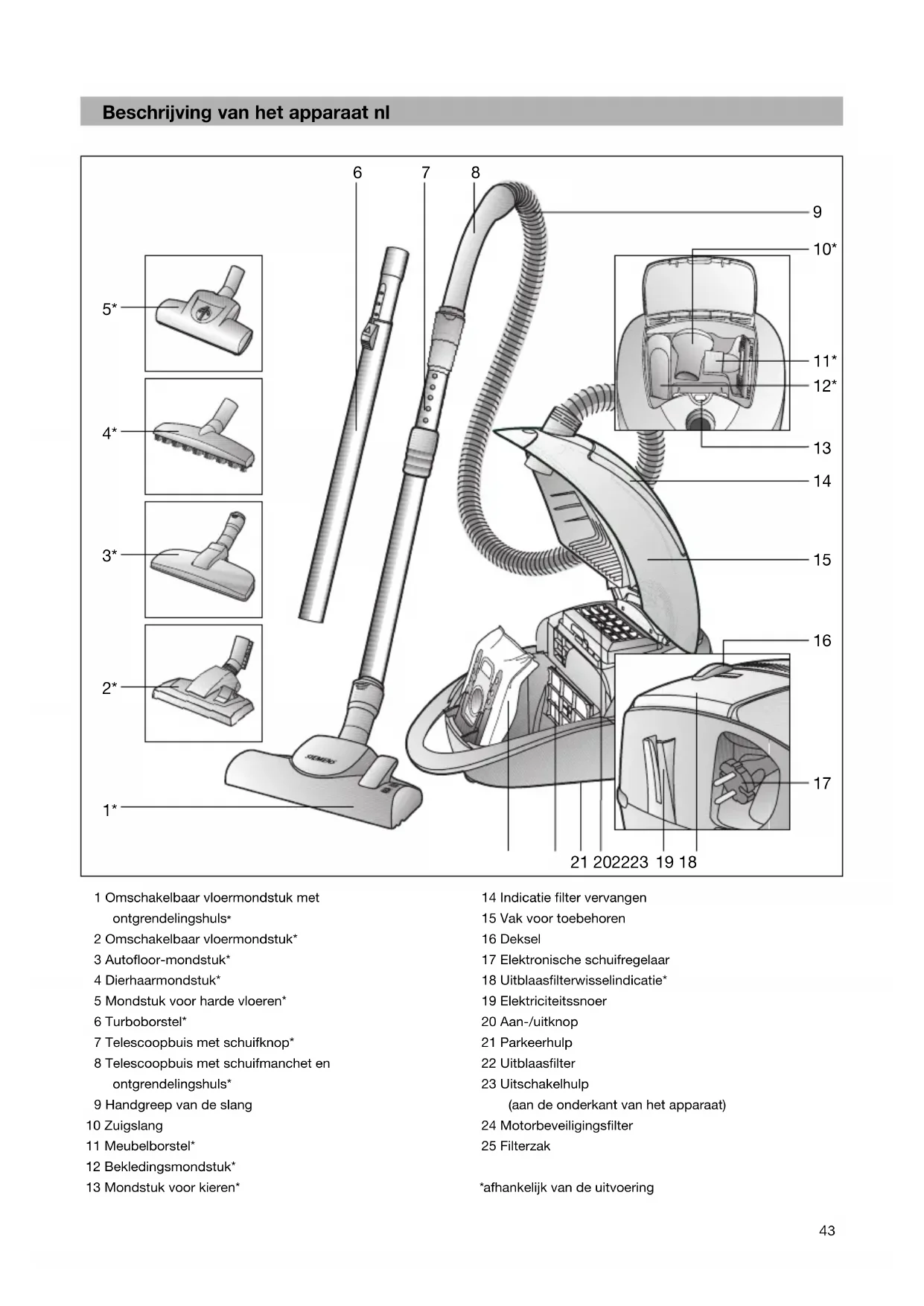 2 Omschakelbaar vloermondstuk* 3 Autofloor-mondstuk* 4 Dierhaarmondstuk* 5 Mondstuk voor harde vloeren* 6 Turboborstel* 7 Telescoopbuis met schuifknop* 8 Telescoopbuis met schuifmanchet en ontgrendelingshuls* 9 Handgreep van de slang 10 Zuigslang 11 Meubelborstel* 12 Bekledingsmondstuk* 13 Mondstuk voor kieren* 14 Indicatie filter vervangen 15 Vak voor toebehoren 16 Deksel 17 Elektronische schuifregelaar 18 Uitblaasfilterwisselindicatie* 19 Elektriciteitssnoer 20 Aan-/uitknop 21 Parkeerhulp 22 Uitblaasfilter 23 Uitschakelhulp (aan de onderkant van het apparaat) 24 Motorbeveiligingsfilter 25 Filterzak