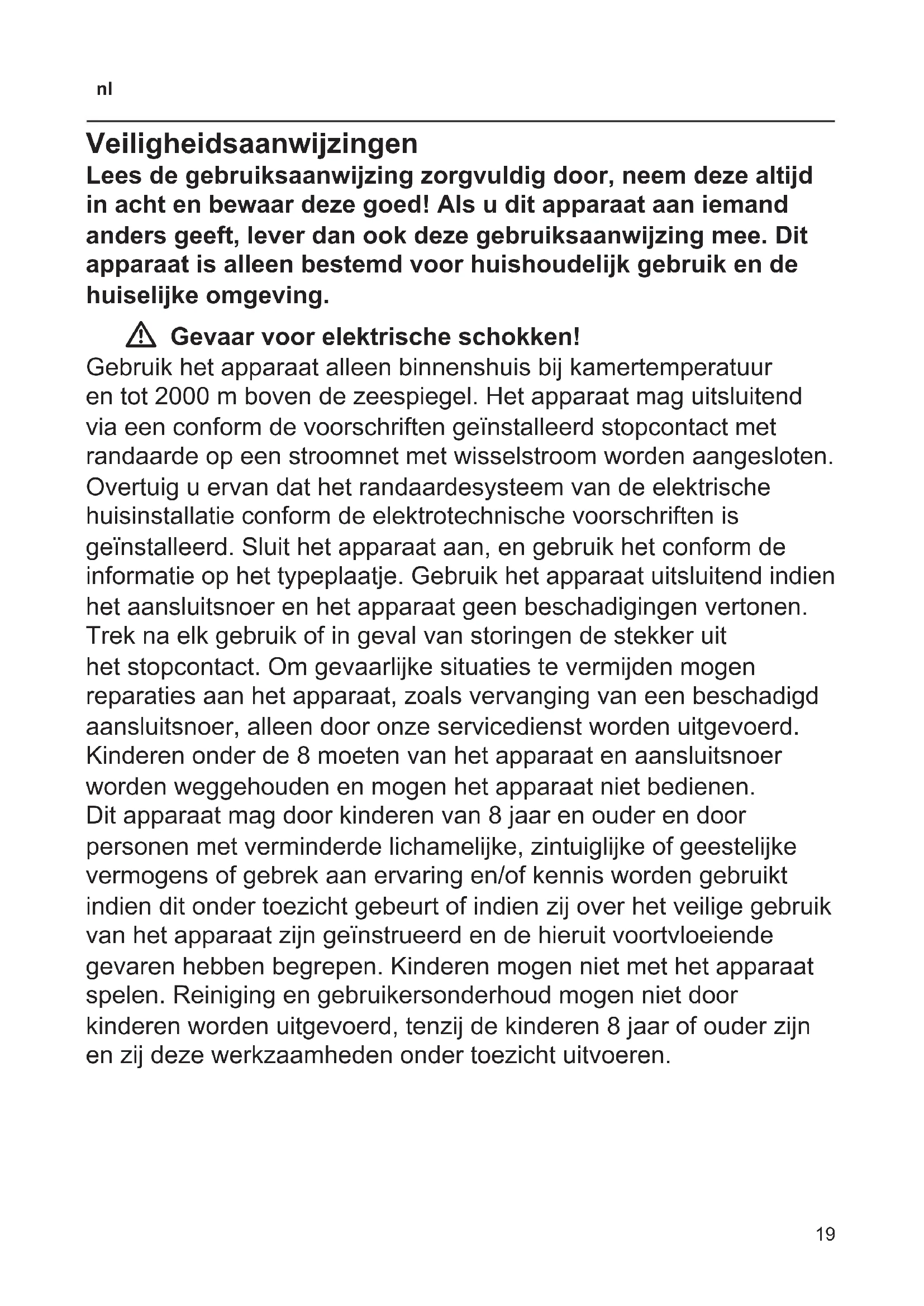 Veiligheidsaanwijzingen Lees de gebruiksaanwijzing zorgvuldig door, neem deze altijd in acht en bewaar deze goed! Als u dit apparaat aan iemand anders geeft, lever dan ook deze gebruiksaanwijzing mee. Dit apparaat is alleen bestemd voor huishoudelijk gebruik en de huiselijke omgeving. W Gevaar voor elektrische schokken! Gebruik het apparaat alleen binnenshuis bij kamertemperatuur en tot 2000 m boven de zeespiegel. Het apparaat mag uitsluitend via een conform de voorschriften geïnstalleerd stopcontact met randaarde op een stroomnet met wisselstroom worden aangesloten. Overtuig u ervan dat het randaardesysteem van de elektrische huisinstallatie conform de elektrotechnische voorschriften is geïnstalleerd. Sluit het apparaat aan, en gebruik het conform de informatie op het typeplaatje. Gebruik het apparaat uitsluitend indien het aansluitsnoer en het apparaat geen beschadigingen vertonen. Trek na elk gebruik of in geval van storingen de stekker uit het stopcontact. Om gevaarlijke situaties te vermijden mogen reparaties aan het apparaat, zoals vervanging van een beschadigd aansluitsnoer, alleen door onze servicedienst worden uitgevoerd. Kinderen onder de 8 moeten van het apparaat en aansluitsnoer worden weggehouden en mogen het apparaat niet bedienen. Dit apparaat mag door kinderen van 8 jaar en ouder en door personen met verminderde lichamelijke, zintuiglijke of geestelijke vermogens of gebrek aan ervaring en/of kennis worden gebruikt indien dit onder toezicht gebeurt of indien zij over het veilige gebruik van het apparaat zijn geïnstrueerd en de hieruit voortvloeiende gevaren hebben begrepen. Kinderen mogen niet met het apparaat spelen. Reiniging en gebruikersonderhoud mogen niet door kinderen worden uitgevoerd, tenzij de kinderen 8 jaar of ouder zijn en zij deze werkzaamheden onder toezicht uitvoeren.20