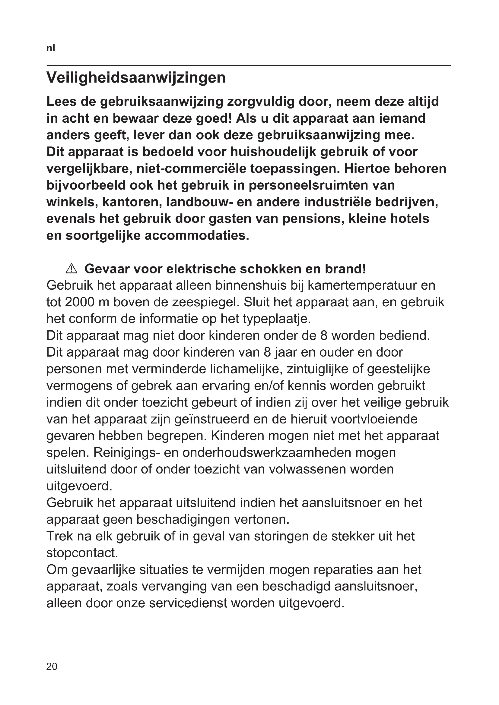 Veiligheidsaanwijzingen Lees de gebruiksaanwijzing zorgvuldig door, neem deze altijd in acht en bewaar deze goed! Als u dit apparaat aan iemand anders geeft, lever dan ook deze gebruiksaanwijzing mee. Dit apparaat is bedoeld voor huishoudelijk gebruik of voor vergelijkbare, niet-commerciële toepassingen. Hiertoe behoren bijvoorbeeld ook het gebruik in personeelsruimten van winkels, kantoren, landbouw- en andere industriële bedrijven, evenals het gebruik door gasten van pensions, kleine hotels en soortgelijke accommodaties. A Gevaar voor elektrische schokken en brand! Gebruik het apparaat alleen binnenshuis bij kamertemperatuur en tot 2000 m boven de zeespiegel. Sluit het apparaat aan, en gebruik het conform de informatie op het typeplaatje. Dit apparaat mag niet door kinderen onder de 8 worden bediend. Dit apparaat mag door kinderen van 8 jaar en ouder en door personen met verminderde lichamelijke, zintuiglijke of geestelijke vermogens of gebrek aan ervaring en/of kennis worden gebruikt indien dit onder toezicht gebeurt of indien zij over het veilige gebruik van het apparaat zijn geïnstrueerd en de hieruit voortvloeiende gevaren hebben begrepen. Kinderen mogen niet met het apparaat spelen. Reinigings- en onderhoudswerkzaamheden mogen uitsluitend door of onder toezicht van volwassenen worden uitgevoerd. Gebruik het apparaat uitsluitend indien het aansluitsnoer en het apparaat geen beschadigingen vertonen. Trek na elk gebruik of in geval van storingen de stekker uit het stopcontact. Om gevaarlijke situaties te vermijden mogen reparaties aan het apparaat, zoals vervanging van een beschadigd aansluitsnoer, alleen door onze servicedienst worden uitgevoerd.21