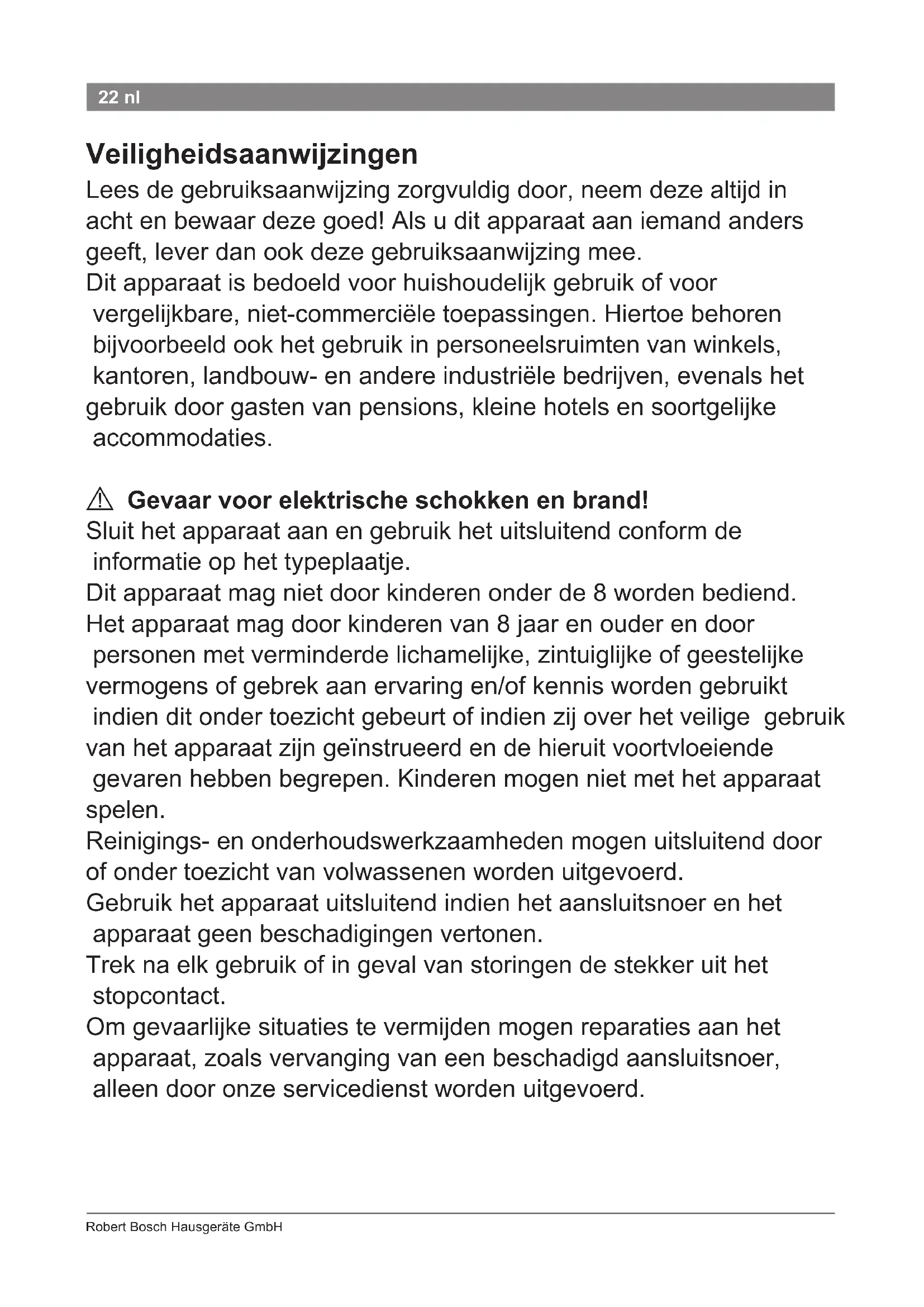 Levensgevaar! Het apparaat nooit met water in aanraking laten komen. Er bestaat ook gevaar bij een uitgeschakeld apparaat, daarom na gebruik of tijdens een onderbreking van het gebruik de stekker uit het stopcontact trekken. De inbouw van een aardlekschakelaar tot 30 mA in de huisinstallatie biedt extra bescherming. Laat u hiervoor adviseren door een erkend elektroninstallateur.