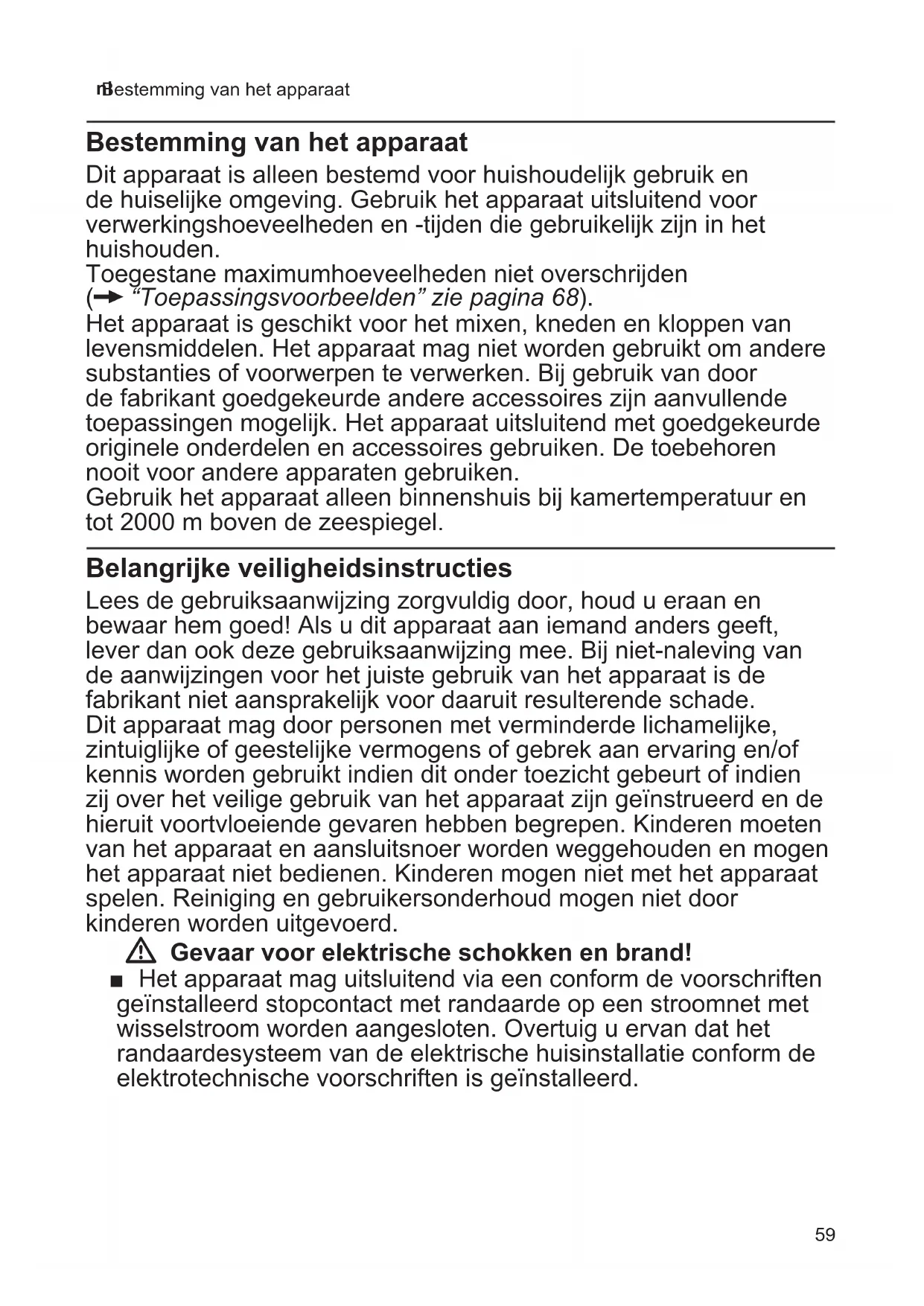 Bestemming van het apparaat Bestemming van het apparaat Dit apparaat is alleen bestemd voor huishoudelijk gebruik en de huiselijke omgeving. Gebruik het apparaat uitsluitend voor verwerkingshoeveelheden en tijden die gebruikelijk zijn in het huishouden. Toegestane maximumhoeveelheden niet overschrijden (X “Toepassingsvoorbeelden” zie pagina 68). Het apparaat is geschikt voor het mixen, kneden en kloppen van levensmiddelen. Het apparaat mag niet worden gebruikt om andere substanties of voorwerpen te verwerken. Bij gebruik van door de fabrikant goedgekeurde andere accessoires zijn aanvullende toepassingen mogelijk. Het apparaat uitsluitend met goedgekeurde originele onderdelen en accessoires gebruiken. De toebehoren nooit voor andere apparaten gebruiken. Gebruik het apparaat alleen binnenshuis bij kamertemperatuur en tot 2000 m boven de zeespiegel. Belangrijke veiligheidsinstructies Lees de gebruiksaanwijzing zorgvuldig door, houd u eraan en bewaar hem goed! Als u dit apparaat aan iemand anders geeft, lever dan ook deze gebruiksaanwijzing mee. Bij nietnaleving van de aanwijzingen voor het juiste gebruik van het apparaat is de fabrikant niet aansprakelijk voor daaruit resulterende schade. Dit apparaat mag door personen met verminderde lichamelijke, zintuiglijke of geestelijke vermogens of gebrek aan ervaring en/of kennis worden gebruikt indien dit onder toezicht gebeurt of indien zij over het veilige gebruik van het apparaat zijn geïnstrueerd en de hieruit voortvloeiende gevaren hebben begrepen. Kinderen moeten van het apparaat en aansluitsnoer worden weggehouden en mogen het apparaat niet bedienen. Kinderen mogen niet met het apparaat spelen. Reiniging en gebruikersonderhoud mogen niet door kinderen worden uitgevoerd. W Gevaar voor elektrische schokken en brand! ■ Het apparaat mag uitsluitend via een conform de voorschriften geïnstalleerd stopcontact met randaarde op een stroomnet met wisselstroom worden aangesloten. Overtuig u ervan dat het randaardesysteem van de elektrische huisinstallatie conform de elektrotechnische voorschriften is geïnstalleerd.60 nl Belangrijke veiligheidsinstructies ■ Het apparaat uitsluitend aansluiten en gebruiken volgens de gegevens op het typeplaatje. Alleen gebruiken wanneer het aansluitsnoer en het apparaat niet beschadigd zijn. Om gevaren te vermijden, mogen reparaties aan het apparaat, zoals het vervangen van een beschadigd aansluitsnoer, uitsluitend worden uitgevoerd door onze klantenservice. ■ Het apparaat uitsluitend in en uitschakelen met de draaischakelaar. ■ Het apparaat nooit aansluiten op een tijdschakelaar of op een op afstand bedienbaar stopcontact. Tijdens het gebruik altijd toezicht houden op het apparaat! ■ Het apparaat niet neerzetten op of in de buurt van hete oppervlakken, zoals fornuisplaten. Het netsnoer niet met hete delen in aanraking brengen of over scherpe randen trekken. ■ Het basisapparaat niet in water dompelen en niet in de vaatwasser doen. Gebruik geen stoomreiniger. Het apparaat niet met vochtige handen gebruiken. ■ Het apparaat moet na ieder gebruik, als er geen toezicht aanwezig is, voor de montage, demontage of reiniging en bij storingen altijd van het net worden gescheiden. W Gevaar voor letsel! ■ Voordat u toebehoren of hulpstukken vervangt die bewegen tijdens het gebruik, moet het apparaat worden uitgeschakeld en worden losgemaakt van het stroomnet. Na het uitschakelen loopt de aandrijving nog even na. Wacht tot de aandrijving geheel stilstaat. ■ Verstel de draaiarm niet wanneer het apparaat ingeschakeld is. ■ Hulpstukken alleen gebruiken als de kom is geplaatst, het deksel is aangebracht en het aandrijvingsbeschermdeksel is geplaatst! Bij gebruik van toebehoren de kom, het deksel en het aandrijvings beschermdeksel volgens de gebruiksaanwijzing aanbrengen! ■ Tijdens het gebruik nooit met de handen in de kom of in de vulopening grijpen. Geen voorwerpen (bijv. kooklepel) in de kom of de vulopening steken. Handen, haren, kleding en andere voorwerpen op een afstand houden van roterende delen. ■ Hulpstukken nooit gelijktijdig met een of 2 toebehoren gebruiken. Neem bij gebruik van toebehoren zowel deze als ook de bijgevoegde gebruiksaanwijzingen in acht. ■ De toebehoren alleen in compleet samengebouwde toestand gebruiken. Toebehoren nooit samenbouwen terwijl het op het basisapparaat is aangebracht. Toebehoren alleen gebruiken in de hiervoor bestemde werkstand. ■ Niet in de scherpe messen en randen van de jnmaakschijven grijpen. Fijnmaakschijven alleen aan de rand vastpakken! ■ Mixermes niet met blote handen reinigen.61