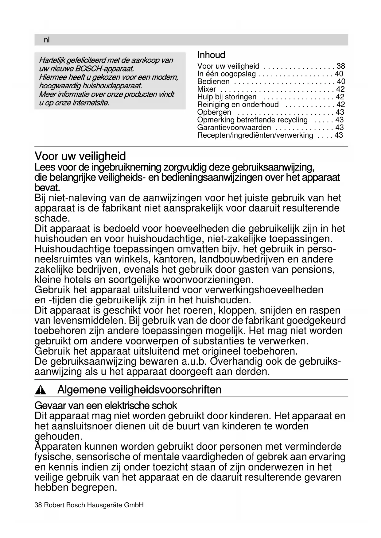 - Recepten/ingrediënten/verwerking Voor uw veiligheid Lees voor de ingebruikneming zorgvuldig deze gebruiksaanwijzing, die belangrijke veiligheids- en bedieningsaanwijzingen over het apparaat bevat. Bij niet-naleving van de aanwijzingen voor het juiste gebruik van het apparaat is de fabrikant niet aansprakelijk voor daaruit resulterende schade. Dit apparaat is bedoeld voor hoeveelheden die gebruikelijk zijn in het huishouden en voor huishoudachtige, niet-zakelijke toepassingen. Huishoudachtige toepassingen omvatten bijv. het gebruik in perso- neelsruimtes van winkels, kantoren, landbouwbedrijven en andere zakelijke bedrijven, evenals het gebruik door gasten van pensions, kleine hotels en soortgelijke woonvoorzieningen. Gebruik het apparaat uitsluitend voor verwerkingshoeveelheden en -tijden die gebruikelijk zijn in het huishouden. Dit apparaat is geschikt voor het roeren, kloppen, snijden en raspen van levensmiddelen. Bij gebruik van de door de fabrikant goedgekeurd toebehoren zijn andere toepassingen mogelijk. Het mag niet worden gebruikt om andere voorwerpen of substanties te verwerken. Gebruik het apparaat uitsluitend met origineel toebehoren. De gebruiksaanwijzing bewaren a.u.b. Overhandig ook de gebruiks- aanwijzing als u het apparaat doorgeeft aan derden. , Algemene veiligheidsvoorschriften Gevaar van een elektrische schok Dit apparaat mag niet worden gebruikt door kinderen. Het apparaat en het aansluitsnoer dienen uit de buurt van kinderen te worden gehouden. Apparaten kunnen worden gebruikt door personen met verminderde fysische, sensorische of mentale vaardigheden of gebrek aan ervaring en kennis indien zij onder toezicht staan of zijn onderwezen in het veilige gebruik van het apparaat en de daaruit resulterende gevaren hebben begrepen. p. 43