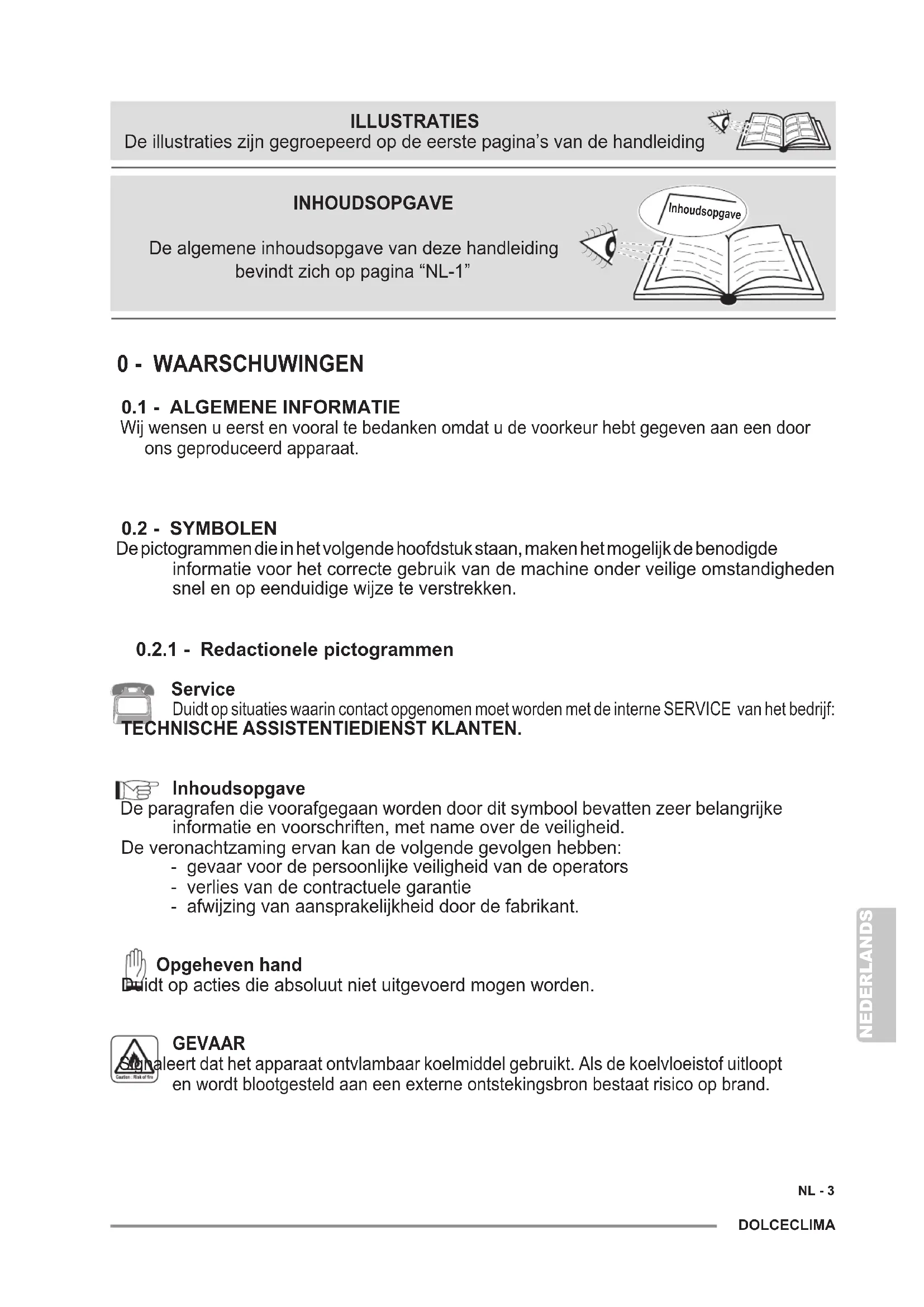 Service Duidt op situaties waarin contact opgenomen moet worden met de interne SERVICE van het bedrijf: TECHNISCHE ASSISTENTIEDIENST KLANTEN. Inhoudsopgave De paragrafen die voorafgegaan worden door dit symbool bevatten zeer belangrijke informatie en voorschriften, met name over de veiligheid. De veronachtzaming ervan kan de volgende gevolgen hebben: - gevaar voor de persoonlijke veiligheid van de operators - verlies van de contractuele garantie - afwijzing van aansprakelijkheid door de fabrikant. Opgeheven hand Duidt op acties die absoluut niet uitgevoerd mogen worden. GEVAAR Signaleert dat het apparaat ontvlambaar koelmiddel gebruikt. Als de koelvloeistof uitloopt en wordt blootgesteld aan een externe ontstekingsbron bestaat risico op brand. Inhoudsopgave INHOUDSOPGAVE De algemene inhoudsopgave van deze handleiding bevindt zich op pagina “NL-1” ILLUSTRATIES De illustraties zijn gegroepeerd op de eerste pagina’s van de handleidingNEDERLANDS NL - 4