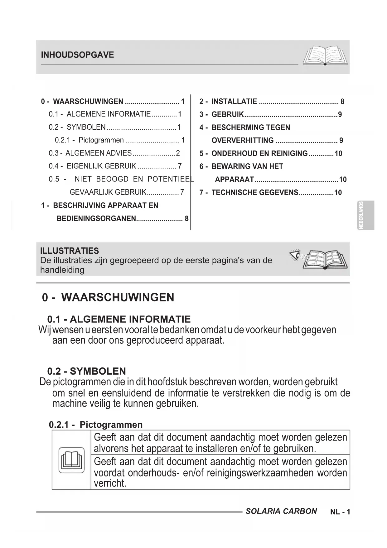 apparaat intact is. Het verpakkingsmateriaal kan een mogelijkSOLARIA CARBON NL - 3 NEDERLANDS gevaar vormen. Houd het daarom buiten bereik van kinderen.
