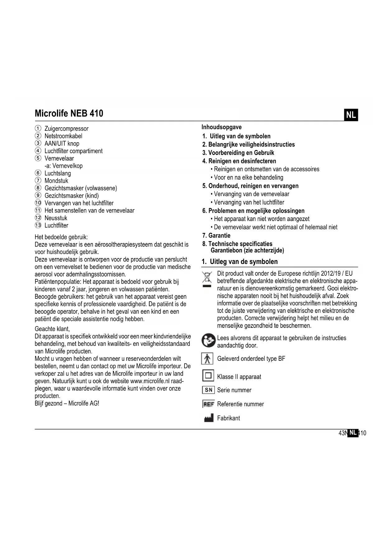 Dit product valt onder de Europese richtlijn 2012/19 / EU betreffende afgedankte elektrische en elektronische appa- ratuur en is dienovereenkomstig gemarkeerd. Gooi elektro- nische apparaten nooit bij het huishoudelijk afval. Zoek informatie over de plaatselijke voorschriften met betrekking tot de juiste verwijdering van elektrische en elektronische producten. Correcte verwijdering helpt het milieu en de menselijke gezondheid te beschermen. Lees alvorens dit apparaat te gebruiken de instructies aandachtig door. Geleverd onderdeel type BF Microlife NEB 410