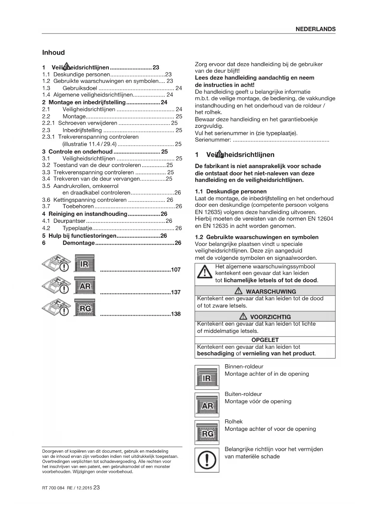 5 Hulp bij functiestoringen ........................... 26 6 Demontage ................................................. 26 Zorg ervoor dat deze handleiding bij de gebruiker vande deur blijft! Lees deze handleiding aandachtig en neem deinstructies in acht! De handleiding geeft u belangrijke informatie m.b.t.deveilige montage, de bediening, de vakkundige instandhouding en het onderhoud van de roldeur / hetrolhek. Bewaar deze handleiding en het garantieboekje zorgvuldig. Vul het serienummer in (zie typeplaatje). Serienummer: ............................................................ 1 Veiligheidsrichtlijnen De fabrikant is niet aansprakelijk voor schade dieontstaat door het niet-naleven van deze handleiding en de veiligheidsrichtlijnen.