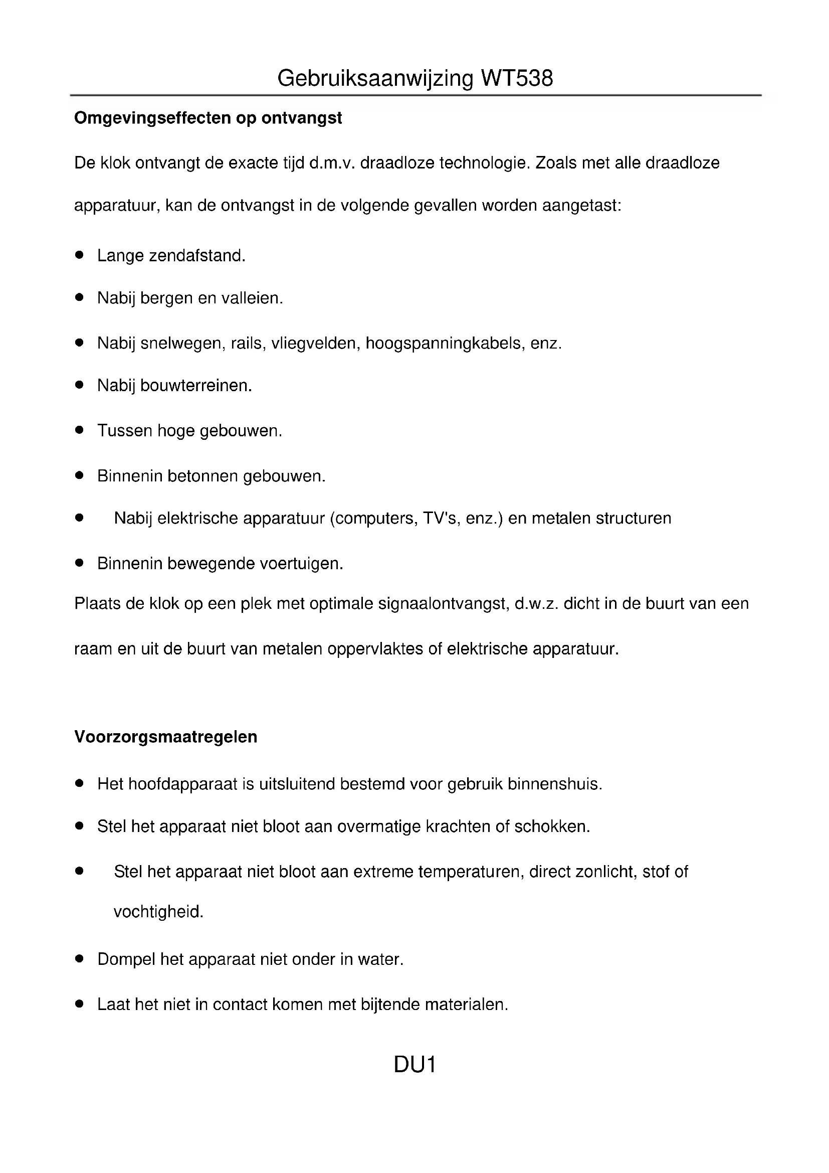 Tensión de alimentación: 2,5 - 3,3 V Adaptador eléctrico: 4,5 V 150 mA Alcance del calendario perpetuo: 2000-1-1~2099-12-31 Zona horaria: -12~12Hr Distancia de proyección: 1,0 - 2,0 metros Margen de medida de temperatura INTERIOR: -9,9 - 50°C/14,2 - 122°F Resolución de la temperatura: 0,1°C/°F Exactitud de la temperatura: 0°C - 40°C: ±1°C -9,9°C - 0°C, 40°C - 50°C: ±2°CGebruiksaanwijzing WT538 DU1 Omgevingseffecten op ontvangst De klok ontvangt de exacte tijd d.m.v. draadloze technologie. Zoals met alle draadloze apparatuur, kan de ontvangst in de volgende gevallen worden aangetast: Lange zendafstand. Nabij bergen en valleien. Nabij snelwegen, rails, vliegvelden, hoogspanningkabels, enz. Nabij bouwterreinen. Tussen hoge gebouwen. Binnenin betonnen gebouwen. Nabij elektrische apparatuur (computers, TV's, enz.) en metalen structuren Binnenin bewegende voertuigen. Plaats de klok op een plek met optimale signaalontvangst, d.w.z. dicht in de buurt van een raam en uit de buurt van metalen oppervlaktes of elektrische apparatuur. Voorzorgsmaatregelen Het hoofdapparaat is uitsluitend bestemd voor gebruik binnenshuis. Stel het apparaat niet bloot aan overmatige krachten of schokken. Stel het apparaat niet bloot aan extreme temperaturen, direct zonlicht, stof of vochtigheid. Dompel het apparaat niet onder in water. Laat het niet in contact komen met bijtende materialen.Gebruiksaanwijzing WT538 DU2 Stel het apparaat niet bloot aan open vuur, omdat het kan exploderen. Open nooit de interne achterbehuizing en modificeer geen enkele onderdelen van dit apparaat. Veiligheidswaarschuwingen batterijen Gebruik uitsluitend alkaline batterijen, geen herlaadbare batterijen. Neem bij het plaatsen van de batterijen de juiste polariteit in acht (+/-). Vervang altijd alle batterijen tegelijk. Gebruik nooit nieuwe en gebruikte batterijen door elkaar. Verwijder lege batterijen onmiddellijk. Verwijder de batterijen als het toestel niet wordt gebruikt. Herlaad de batterijen niet en gooi ze niet in vuur, omdat de batterijen zouden kunnen ontploffen. Zorg ervoor dat de batterijen uit de buurt van metalen voorwerpen worden bewaard, omdat hierdoor kortsluiting kan ontstaan. Stel batterijen niet bloot aan extreme temperaturen, vochtigheid of direct zonlicht. Houd alle batterijen buiten bereik van kinderen. Er bestaat gevaar van verstikking. Gebruik het product alleen voor het doel waarvoor deze bestemd!Gebruiksaanwijzing WT538 DU3 Neem wettelijke heffingen in verband met de afvoer van batterijen in aanmerking