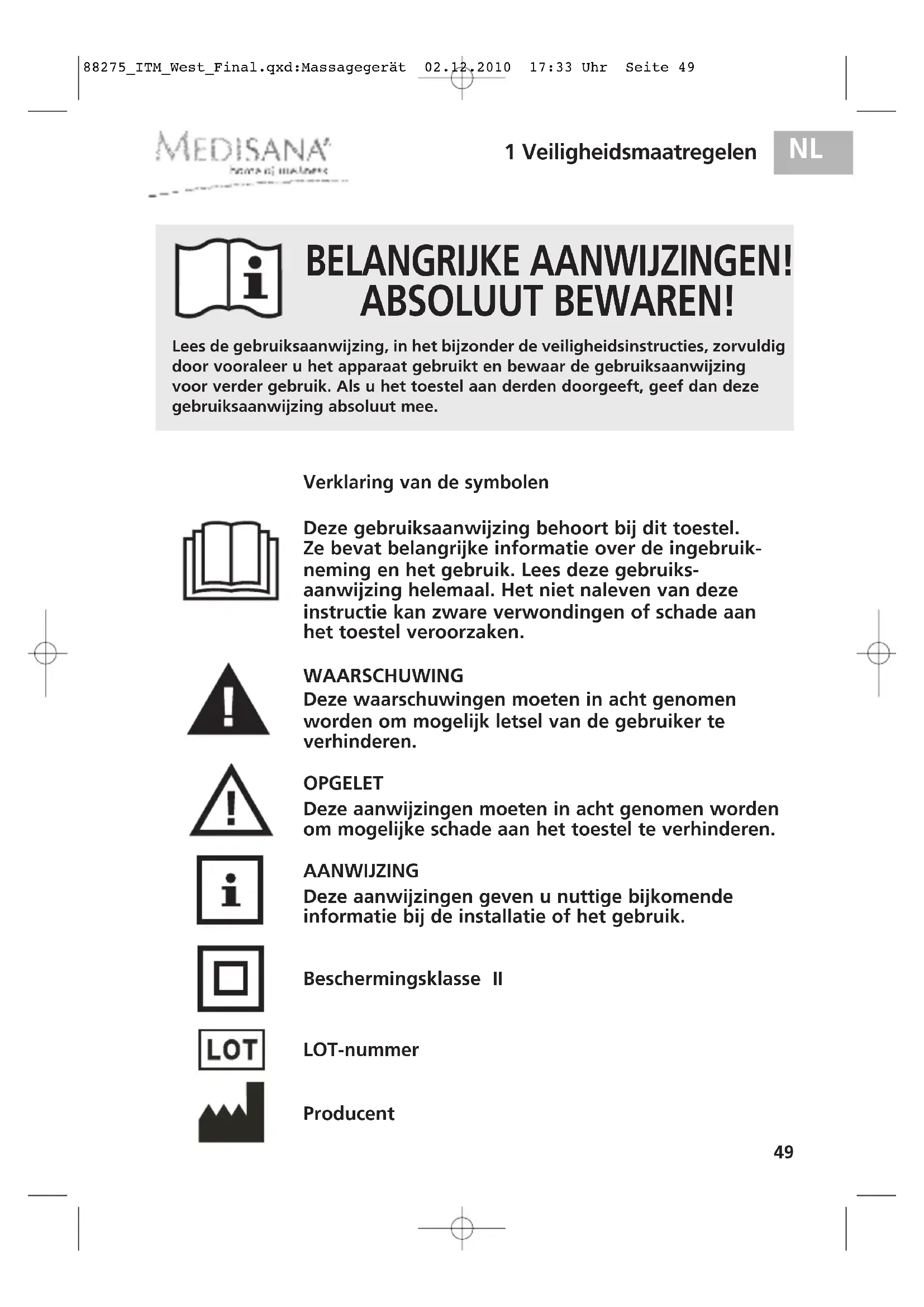 Voor het gewenstesucces en langdurig plezier van uw MEDISANA massageapparaat, raden we u aan om de hierna volgende aanwijzingen voor het gebruik en het onderhoud zorgvuldig door te lezen.