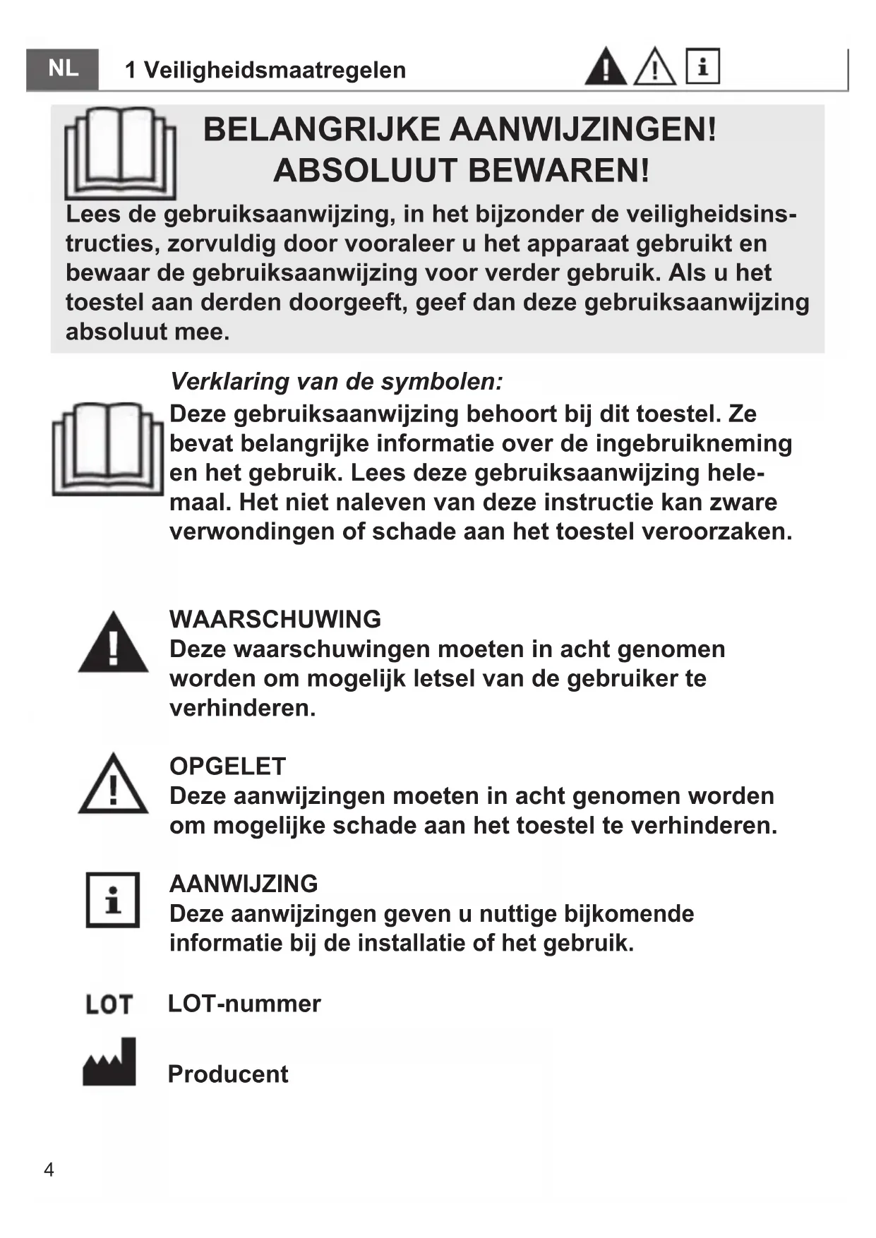 Lees de gebruiksaanwijzing, in het bijzonder de veiligheidsinstrumenties, zorvuldig door vooraleer u het apparaat gebruikt en bewaar de gebruiksaanwijzing voor verder gebruik. Als u het toestel aan derden doorgeeft, geef dan deze gebruiksaanwijzing absoluut mee.