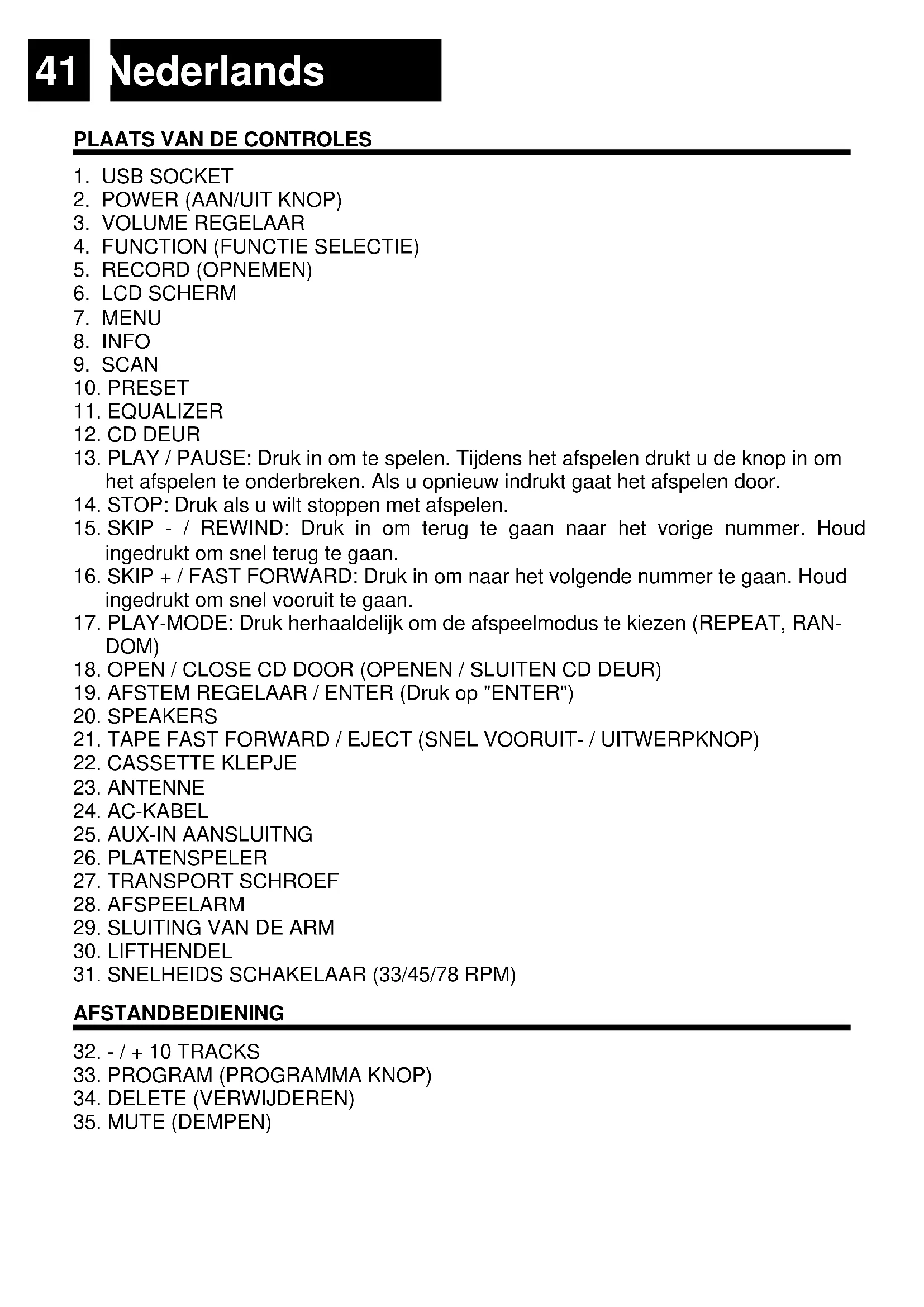 17. PLAY-MODE: Druk herhaaldelijk om de afspeelmodus te kiezen (REPEAT, RAN-