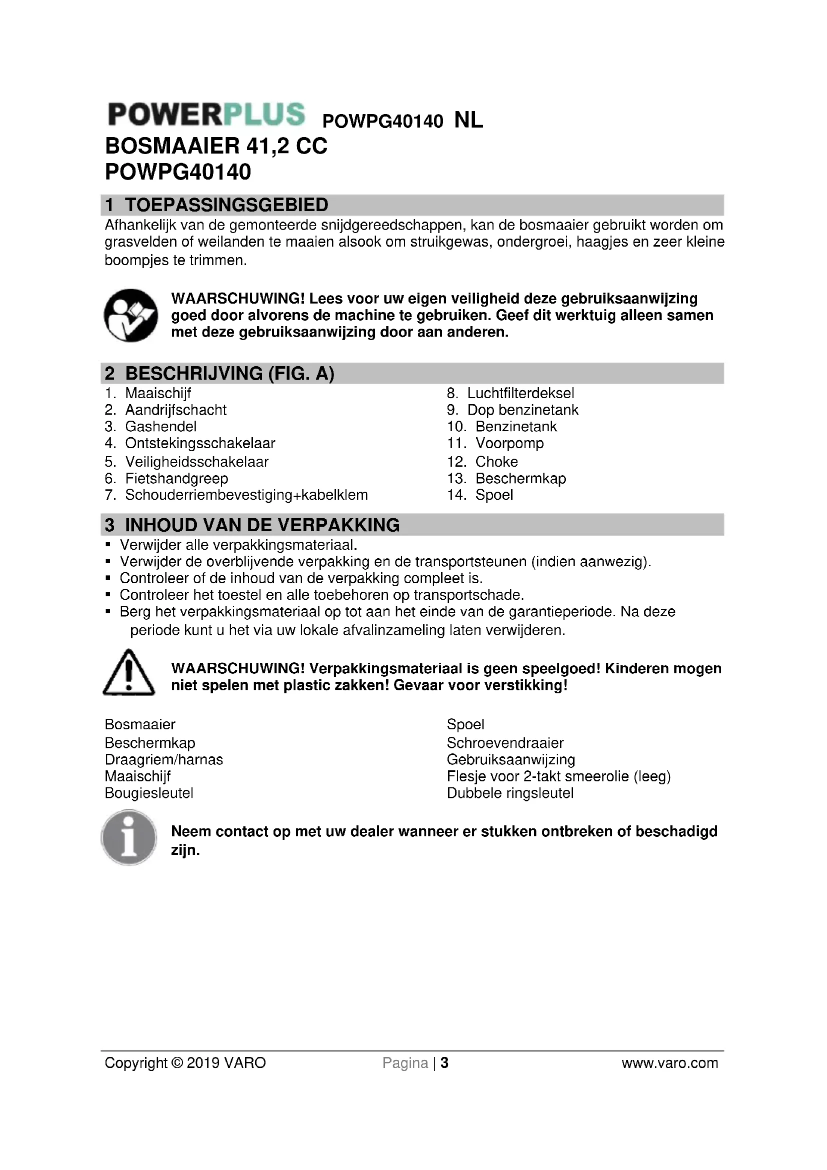 - Berg het verpakkingsmateriaal op tot aan het einde van de garantieperiode. Na deze periode kunt u het via uw lokale afvalinzameling laten verwijderen. WAARSCHUWING! Verpakkingsmateriaal is geen speelgoed! Kinderen mogen niet spelen met plastic zakken! Gevaar voor verstikking! Bosmaaier Beschermkap Draagriem/harnas Maaischijf Bougiesleutel Spoel Schroevendraaier Gebruiksaanwijzing Flesje voor 2-takt smeerolie (leeg) Dubbele ringsleutel Neem contact op met uw dealer wanneer er stukken ontbreken of beschadigd zijn.POWPG40140 NL Copyright © 2019 VARO Pagina | 4 www.varo.com