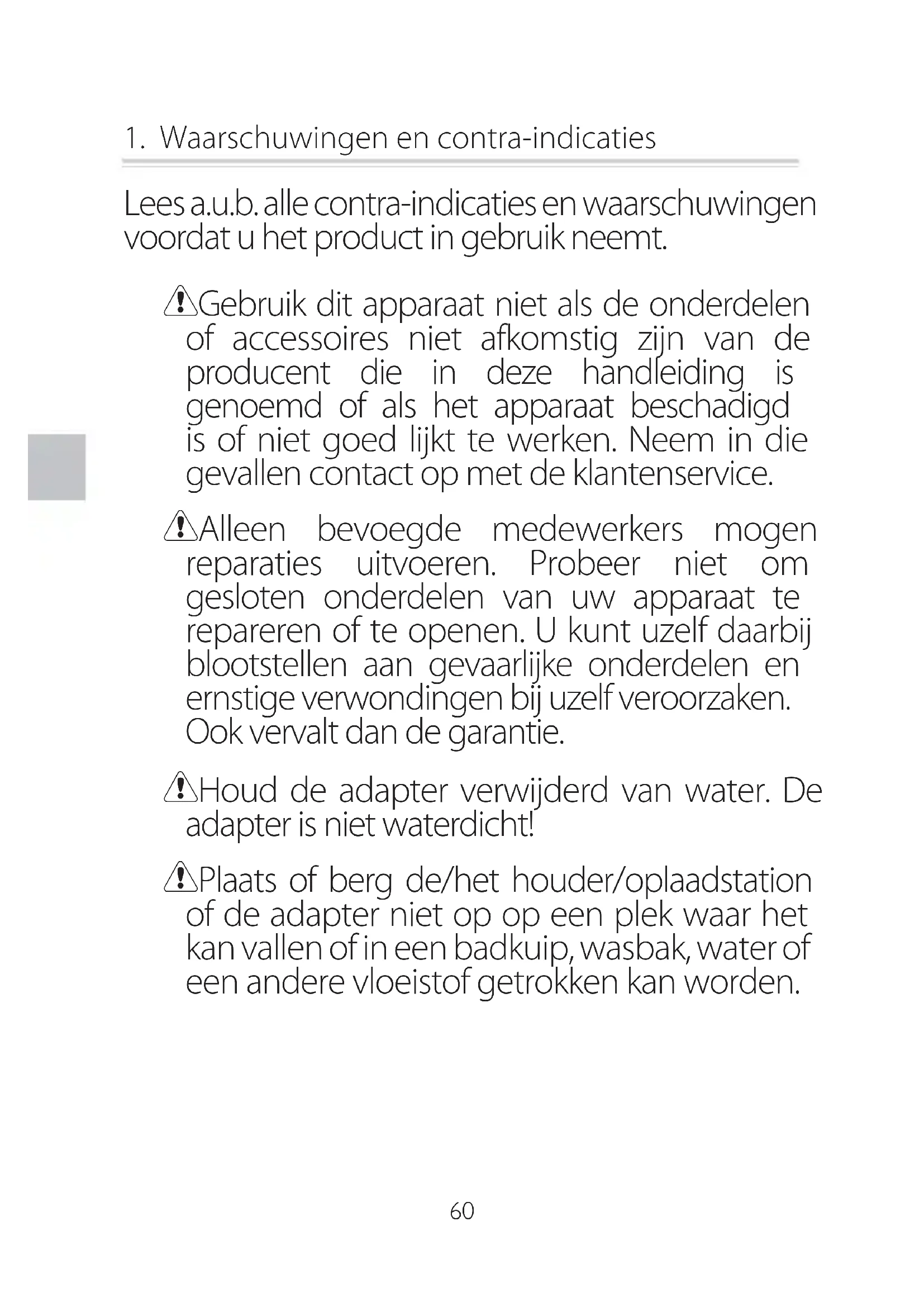 ⚠ Pak de/het houder/oplaadstation of de adapter niet als ze in het water zijn gevallen. Trekonmiddellijkdestekkeruithetstopcontact alvorens u ze pakt. Indien u de/het houder/oplaadstation niet heeft losgekoppeld, kan dat leiden tot een elektrische schok!