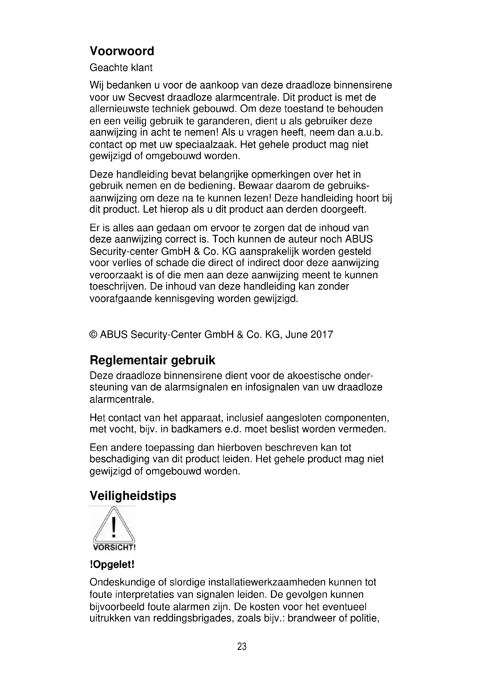 Voorwoord Geachte klant Wij bedanken u voor de aankoop van deze draadloze binnensirene voor uw Secvest draadloze alarmcentrale. Dit product is met de allernieuwste techniek gebouwd. Om deze toestand te behouden en een veilig gebruik te garanderen, dient u als gebruiker deze aanwijzing in acht te nemen! Als u vragen heeft, neem dan a.u.b. contact op met uw speciaalzaak. Het gehele product mag niet gewijzigd of omgebouwd worden. Deze handleiding bevat belangrijke opmerkingen over het in gebruik nemen en de bediening. Bewaar daarom de gebruiks- aanwijzing om deze na te kunnen lezen! Deze handleiding hoort bij dit product. Let hierop als u dit product aan derden doorgeeft. Er is alles aan gedaan om ervoor te zorgen dat de inhoud van deze aanwijzing correct is. Toch kunnen de auteur noch ABUS Security-center GmbH & Co. KG aansprakelijk worden gesteld voor verlies of schade die direct of indirect door deze aanwijzing veroorzaakt is of die men aan deze aanwijzing meent te kunnen toeschrijven. De inhoud van deze handleiding kan zonder voorafgaande kennisgeving worden gewijzigd. © ABUS Security-Center GmbH & Co. KG, June 2017 Reglementair gebruik Deze draadloze binnensirene dient voor de akoestische onder- steuning van de alarmsignalen en infosignalen van uw draadloze alarmcentrale. Het contact van het apparaat, inclusief aangesloten componenten, met vocht, bijv. in badkamers e.d. moet beslist worden vermeden. Een andere toepassing dan hierboven beschreven kan tot beschadiging van dit product leiden. Het gehele product mag niet gewijzigd of omgebouwd worden. Veiligheidstips !Opgelet! Ondeskundige of slordige installatiewerkzaamheden kunnen tot foute interpretaties van signalen leiden. De gevolgen kunnen bijvoorbeeld foute alarmen zijn. De kosten voor het eventueel uitrukken van reddingsbrigades, zoals bijv.: brandweer of politie,24 moet de exploitant van de installatie betalen. Het apparaat werd uitsluitend voor het gebruik binnenshuis geconstrueerd. Neem de instructies en opmerkingen in deze handleiding in acht! Als u zich niet aan deze handleiding houdt, vervalt uw aanspraak op garantie! Een andere toepassing dan de beschreven kan tot beschadiging van deze producten leiden. Het elektronische deel van het product mag niet veranderd of omgebouwd worden. We aanvaarden geen aansprakelijkheid voor gevolgschade! !Waarschuwingen i.v.m. de batterij! Het toestel wordt door 3 x 1,5 V monocellen van gelijkspanning voorzien. Om een lange levensduur te garanderen en brand en verwondingen te voorkomen, dient u de volgende aanwijzingen in acht te nemen: Voer de batterij niet via het huisvuil af. De batterij mag niet direct aan een warmtebron of zonlicht worden blootgesteld en niet op een plaats met een heel hoge temperatuur worden bewaard. De batterij mag niet worden verbrand. De batterij mag niet met water in aanraking komen. De batterij mag niet uiteen gehaald worden, er mag niet in worden geprikt en ze mag niet beschadigd worden. De batterijcontacten mogen niet kortgesloten worden. De batterij mag niet in de handen van kleine kinderen terechtkomen. De batterij is niet herlaadbaar. Installatie U moet de sirene plat tegen de muur op een praktische hoogte voor de bediener monteren. Zorg ervoor dat een geschikte spanningsvoeding van naar keuze 12 V DC of 3 x 1,5 V monocel D of beide voorhanden is. U kunt de binnensirene tot 100 m voor uw draadloze alarmcentrale aanbrengen. De ontvangstreikwijdte is sterk van de bouwkundige omstandigheden van het gebouw afhankelijk. Controle van de standplaats U moet de sterkte van het inkomende signaal aan de geplande positie voor de binnensirene meten. U kunt hiervoor onze draadloze testbox FU3801 gebruiken.25 Vermijd de volgende montageplaatsen: In de buurt van of aan grote metalen constructies. Minder dan 1 meter verwijderd van stroomleidingen en metalen, water- en gasbuizen. Binnen stalen behuizingen. Naast elektrische apparaten, vooral computers, fotokopieerapparaten of communicatietoestellen. Om de bodemplaat aan de muur te monteren, lost u de schroef onderaan aan de behuizing en tilt u het voorste deel voorzichtig van de bodemplaat op. Binnenaanzicht