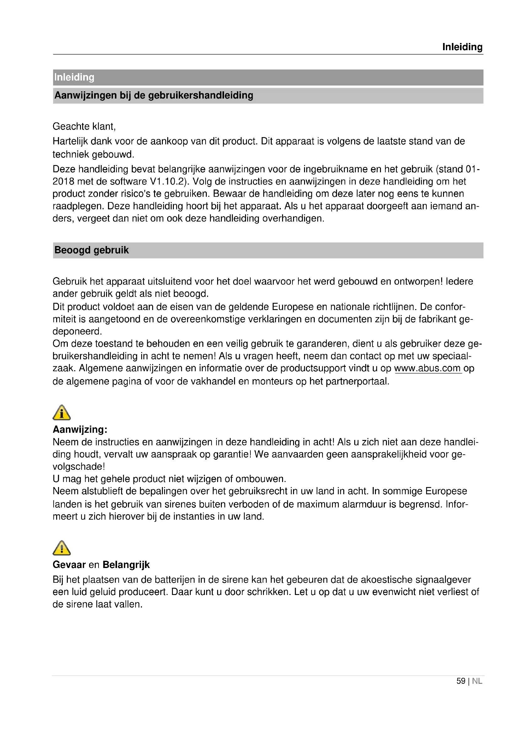 59 | NL Inleiding Aanwijzingen bij de gebruikershandleiding Geachte klant, Hartelijk dank voor de aankoop van dit product. Dit apparaat is volgens de laatste stand van de techniek gebouwd. Deze handleiding bevat belangrijke aanwijzingen voor de ingebruikname en het gebruik (stand 01- 2018 met de software V1.10.2). Volg de instructies en aanwijzingen in deze handleiding om het product zonder risico's te gebruiken. Bewaar de handleiding om deze later nog eens te kunnen raadplegen. Deze handleiding hoort bij het apparaat. Als u het apparaat doorgeeft aan iemand an- ders, vergeet dan niet om ook deze handleiding overhandigen. Beoogd gebruik Gebruik het apparaat uitsluitend voor het doel waarvoor het werd gebouwd en ontworpen! Iedere ander gebruik geldt als niet beoogd. Dit product voldoet aan de eisen van de geldende Europese en nationale richtlijnen. De confor- miteit is aangetoond en de overeenkomstige verklaringen en documenten zijn bij de fabrikant ge- deponeerd. Om deze toestand te behouden en een veilig gebruik te garanderen, dient u als gebruiker deze ge- bruikershandleiding in acht te nemen! Als u vragen heeft, neem dan contact op met uw speciaal- zaak. Algemene aanwijzingen en informatie over de productsupport vindt u op www.abus.com op de algemene pagina of voor de vakhandel en monteurs op het partnerportaal.