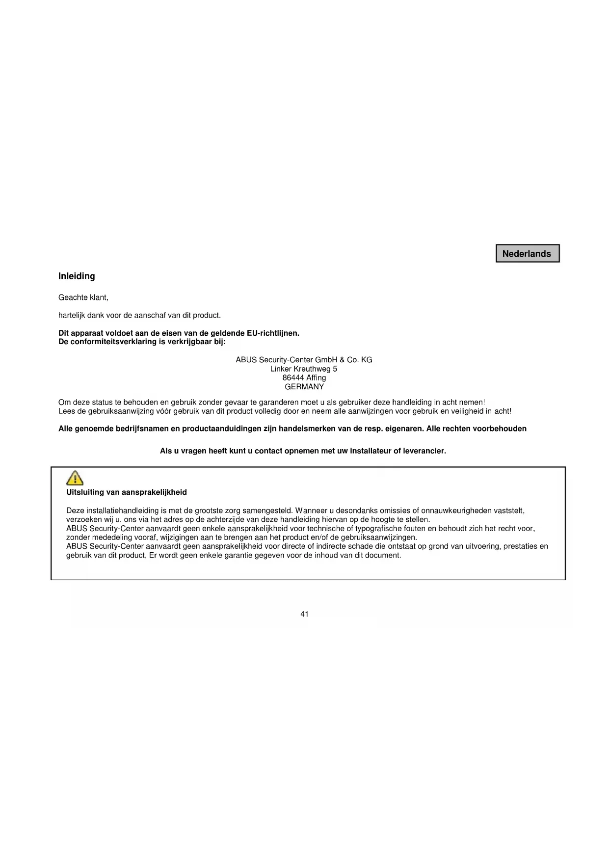 Uitsluiting van aansprakelijkheid Deze installatiehandleiding is met de grootste zorg samengesteld. Wanneer u desondanks omissies of onnauwkeurigheden vaststelt, verzoeken wij u, ons via het adres op de achterzijde van deze handleiding hiervan op de hoogte te stellen. ABUS Security-Center aanvaardt geen enkele aansprakelijkheid voor technische of typografische fouten en behoudt zich het recht voor, zonder mededeling vooraf, wijzigingen aan te brengen aan het product en/of de gebruiksaanwijzingen. ABUS Security-Center aanvaardt geen aansprakelijkheid voor directe of indirecte schade die ontstaat op grond van uitvoering, prestaties en gebruik van dit product, Er wordt geen enkele garantie gegeven voor de inhoud van dit document.42 Nederlands Uitleg van de symbolen