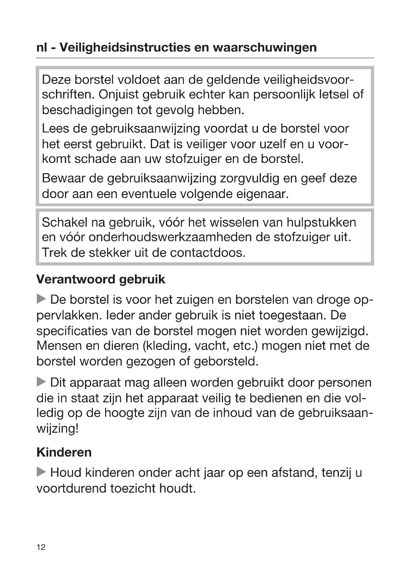 Deze borstel voldoet aan de geldende veiligheidsvoor‐ schriften. Onjuist gebruik echter kan persoonlijk letsel of beschadigingen tot gevolg hebben. Lees de gebruiksaanwijzing voordat u de borstel voor het eerst gebruikt. Dat is veiliger voor uzelf en u voor‐ komt schade aan uw stofzuiger en de borstel. Bewaar de gebruiksaanwijzing zorgvuldig en geef deze door aan een eventuele volgende eigenaar. Schakel na gebruik, vóór het wisselen van hulpstukken en vóór onderhoudswerkzaamheden de stofzuiger uit. Trek de stekker uit de contactdoos. Verantwoord gebruik De borstel is voor het zuigen en borstelen van droge op‐ pervlakken. Ieder ander gebruik is niet toegestaan. De specificaties van de borstel mogen niet worden gewijzigd. Mensen en dieren (kleding, vacht, etc.) mogen niet met de borstel worden gezogen of geborsteld. Dit apparaat mag alleen worden gebruikt door personen die in staat zijn het apparaat veilig te bedienen en die vol‐ ledig op de hoogte zijn van de inhoud van de gebruiksaan‐ wijzing! Kinderen Houd kinderen onder acht jaar op een afstand, tenzij u voortdurend toezicht houdt.nl - Veiligheidsinstructies en waarschuwingen