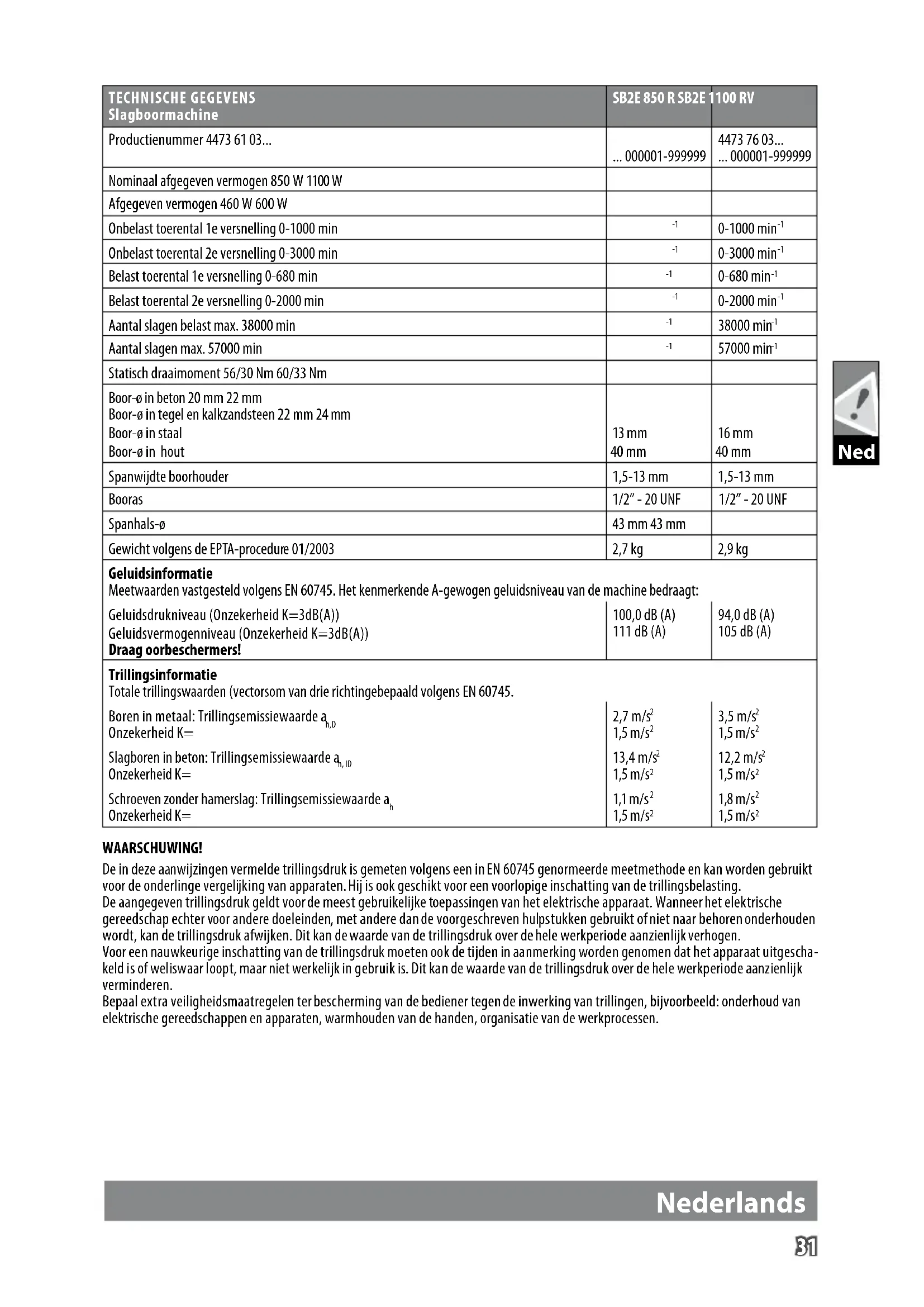 We verklaren geheel onder eigen verantwoordelijkheid dat het pro- duct in de “Technische data” voldoet aan alle relevante bepalingen van de richtlijnen: 2011/65/EU (RoHS) 2014/30/EU 2006/42/EG en de volgende geharmoniseerde normen zijn gebruikt. EN 60745-1:2009 + A11:2010 EN 60745-2-1:2010 EN 60745-2-2:2010 EN 55014-1:2006 + A1:2009 + A2:2011 EN 55014-2:2015 EN 61000-3-2:2014 EN 61000-3-3:2013 EN 50581:2012 Winnenden, 2017-09-25 Alexander Krug / Managing Director Gemachtigd voor samenstelling van de technische documenten Techtronic Industries GmbH Max-Eyth-Straße 10, 71364 Winnenden, Germany NETAANSLUITING Verplaatsbaar gereedschap moet bij het gebruik buiten aan een aardlekschakelaar (FI,RCD,PRCD) aangesloten worden. Uitsluitend op éénfase-wisselstroom en uitsluitend op de op het typeplaatje aangegeven netspanning aansluiten. Aansluiting is ook mogelijk op een stekerdoos zonder aardcontact mogelijk, omdat het is ontwerpen volgens veiligheidsklasse II. Machine alleen uitgeschakeld aan het net aansluiten. ONDERHOUD Altijd de luchtspleten van de machine schoonhouden. Bij intensief slagboorwerk de boorhouder regelmatig van stof ‚bevrijden‘. Hiervoor de machine met de boorhouder loodrecht naar beneden houden en de boorhouder dan over het totale spanbereik openen en sluiten. Het verzamelde stof valt zo uit de boorhouder. Regelmatige toepassing van reinigingsspray (artikelnummer 4932-6217-19) op de spanbekken en spanbekkenboringen wordt aanbevolen. Wanneer de netkabel beschadigd is, moet deze door een klanten- service worden vervangen, omdat daarvoor speciaal gereedschap vereist is. Nederlands33 English Ned Alleen AEG toebehoren en onderdelen gebruiken. Onderdelen welke niet vermeld worden, kunnen het beste door de AEG service- dienst verwisseld worden (zie Serviceadressen). Onder vermelding van het nummer op het machineplaatje is desgewenst een doorsnedetekening van de machine verkrijgbaar bij: Techtronic Industries GmbH, Max-Eyth-Straße10, 71364Win- nenden, Germany. SYMBOLEN OPGELET! WAARSCHUWING! GEVAAR! Voor alle werkzaamheden aan de machine de stekker uit de kontaktdoos trekken. Graag instructies zorgvuldig doorlezen vóórdat u de machine in gebruik neemt. Toebehoren - Wordt niet meegeleverd. Is apart leverbaar. Zie hiervoor het toebehorenprogramma. Elektrische apparaten mogen niet via het huisafval worden afgevoerd. Elektrische en elektronische apparaten moeten gescheiden worden verzameld en voor een milieuvriendelijke afvoer worden afgegeven bij een recyclingbedrijf. Informeer bij uw gemeente of bij uw vakhandelaar naar recyclingbedrijven en inzamelpunten. Elektrisch gereedschap van de beschermingsklasse II. Elektrisch gereedschap waarbij de bescherming tegen ele- ktrische schokken niet afhankelijk is van de basisisolatie, maar waarin ook extra veiligheidsmaatregelen worden toegepast zoals dubbele of versterkte isolatie. CE-keurmerk UkrSEPRO -symbool van overeenstemming. EurAsian-symbool van overeenstemming. Nederlands34 English Dan TEKNISKE DATA Slagboremaskine SB2E 850 R SB2E 1100 RV Produktionsnummer 4473 61 03... ... 000001-999999