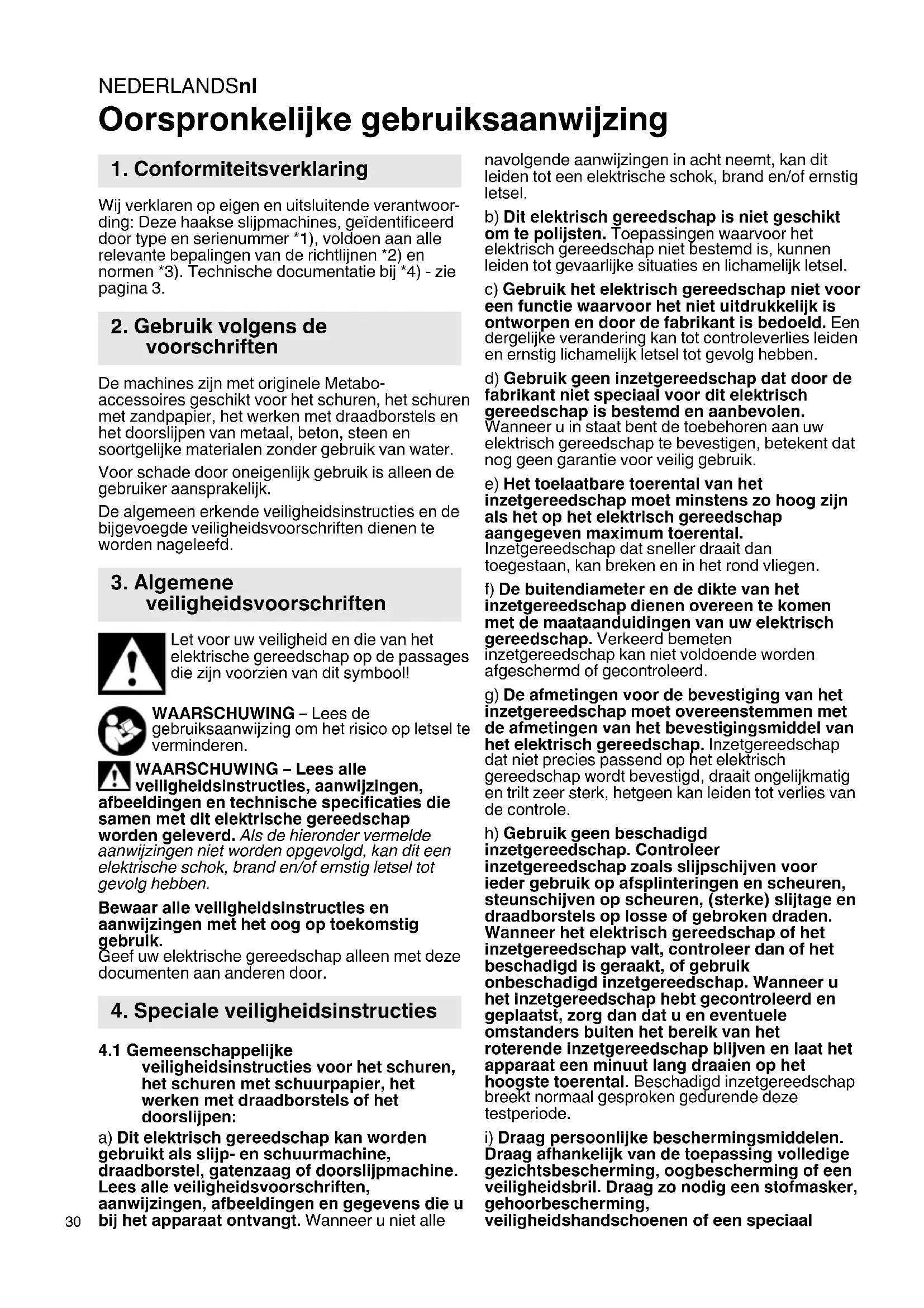 Oorspronkelijke gebruiksaanwijzing Wij verklaren op eigen en uitsluitende verantwoor- ding: Deze haakse slijpmachines, geïdentificeerd door type en serienummer *1), voldoen aan alle relevante bepalingen van de richtlijnen *2) en normen *3). Technische documentatie bij *4) - zie pagina 3. De machines zijn met originele Metabo- accessoires geschikt voor het schuren, het schuren met zandpapier, het werken met draadborstels en het doorslijpen van metaal, beton, steen en soortgelijke materialen zonder gebruik van water. Voor schade door oneigenlijk gebruik is alleen de gebruiker aansprakelijk. De algemeen erkende veiligheidsinstructies en de bijgevoegde veiligheidsvoorschriften dienen te worden nageleefd. Let voor uw veiligheid en die van het elektrische gereedschap op de passages die zijn voorzien van dit symbool! WAARSCHUWING – Lees de gebruiksaanwijzing om het risico op letsel te verminderen. WAARSCHUWING – Lees alle veiligheidsinstructies, aanwijzingen, afbeeldingen en technische specificaties die samen met dit elektrische gereedschap worden geleverd. Als de hieronder vermelde aanwijzingen niet worden opgevolgd, kan dit een elektrische schok, brand en/of ernstig letsel tot gevolg hebben. Bewaar alle veiligheidsinstructies en aanwijzingen met het oog op toekomstig gebruik. Geef uw elektrische gereedschap alleen met deze documenten aan anderen door.
