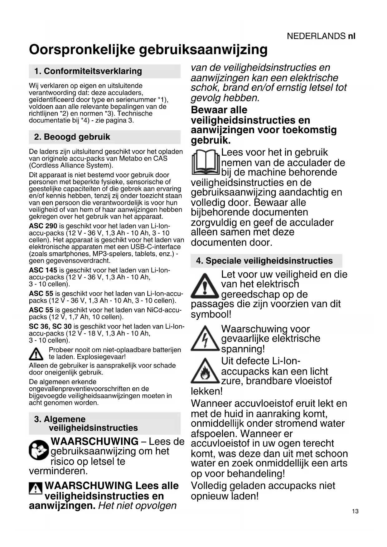 Oorspronkelijke gebruiksaanwijzing Wij verklaren op eigen en uitsluitende verantwoording dat: deze acculaders, geïdentificeerd door type en serienummer *1), voldoen aan alle relevante bepalingen van de richtlijnen *2) en normen *3). Technische documentatie bij *4) - zie pagina 3. De laders zijn uitsluitend geschikt voor het opladen van originele accu-packs van Metabo en CAS (Cordless Alliance System). Dit apparaat is niet bestemd voor gebruik door personen met beperkte fysieke, sensorische of geestelijke capaciteiten of die gebrek aan ervaring en/of kennis hebben, tenzij zij onder toezicht staan van een persoon die verantwoordelijk is voor hun veiligheid of van hem of haar aanwijzingen hebben gekregen over het gebruik van het apparaat. ASC 290 is geschikt voor het laden van Li-Ion- accu-packs (12 V - 36 V, 1,3 Ah - 10 Ah, 3 - 10 cellen). Het apparaat is geschikt voor het laden van elektronische apparaten met een USB-C-interface (zoals smartphones, MP3-spelers, tablets, enz.) - geen gegevensoverdracht. ASC 145 is geschikt voor het laden van Li-Ion- accu-packs (12 V - 36 V, 1,3 Ah - 10 Ah,