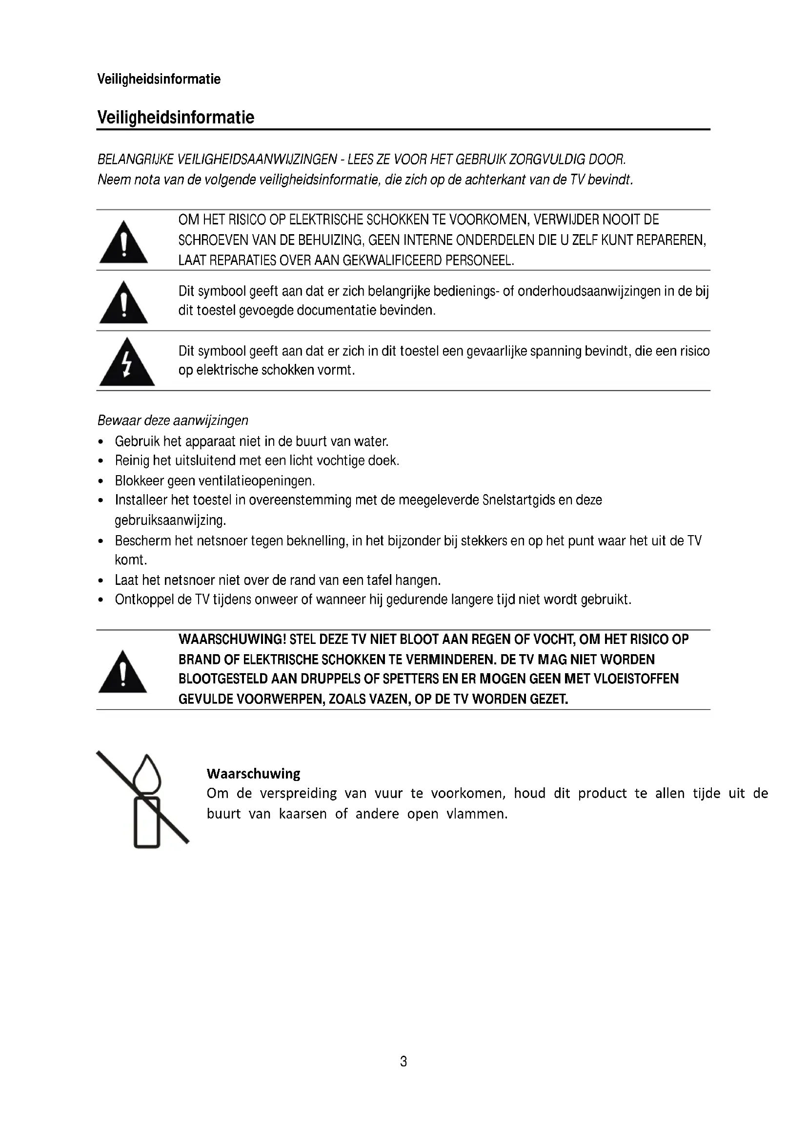 Veiligheidsinformatie BELANGRIJKEVEILIGHEIDSAANWIJZINGEN-LEESZEVOORHETGEBRUIKZORGVULDIGDOOR. Neemnotavandevolgendeveiligheidsinformatie,diezichopdeachterkantvandeTVbevindt. OMHETRISICOOPELEKTRISCHESCHOKKENTEVOORKOMEN,VERWIJDERNOOITDE SCHROEVENVANDEBEHUIZING,GEENINTERNEONDERDELENDIEUZELFKUNTREPAREREN, LAATREPARATIESOVERAANGEKWALIFICEERDPERSONEEL. Ditsymboolgeeftaandaterzichbelangrijkebedienings-ofonderhoudsaanwijzingenindebij dittoestelgevoegdedocumentatiebevinden. Ditsymboolgeeftaandaterzichindittoesteleengevaarlijkespanningbevindt,dieeenrisico opelektrischeschokkenvormt. Bewaardezeaanwijzingen
