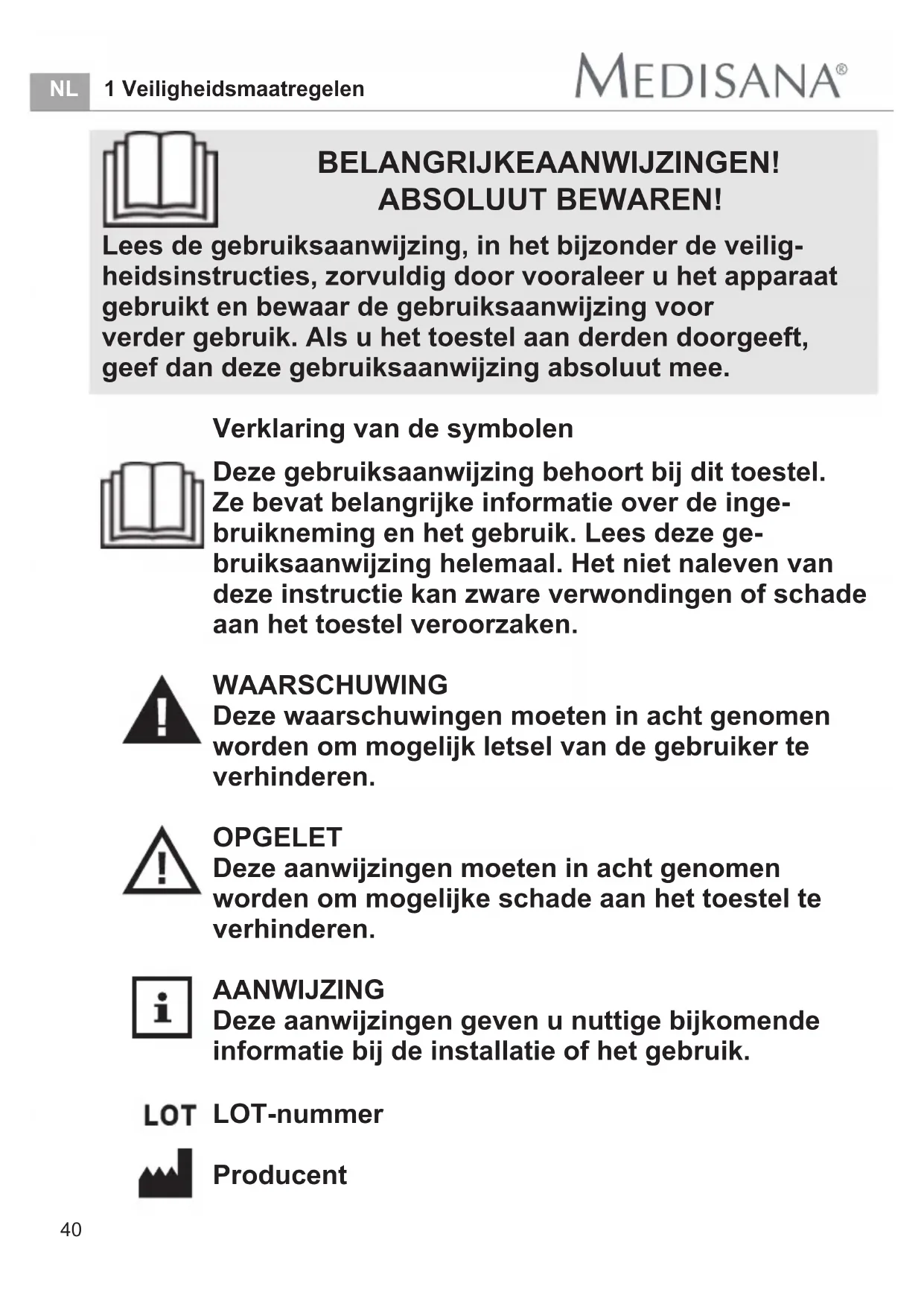 Deze waarschuwingen moeten in acht genomen worden om mogelijk letsel van de gebruiker te verhinderen.