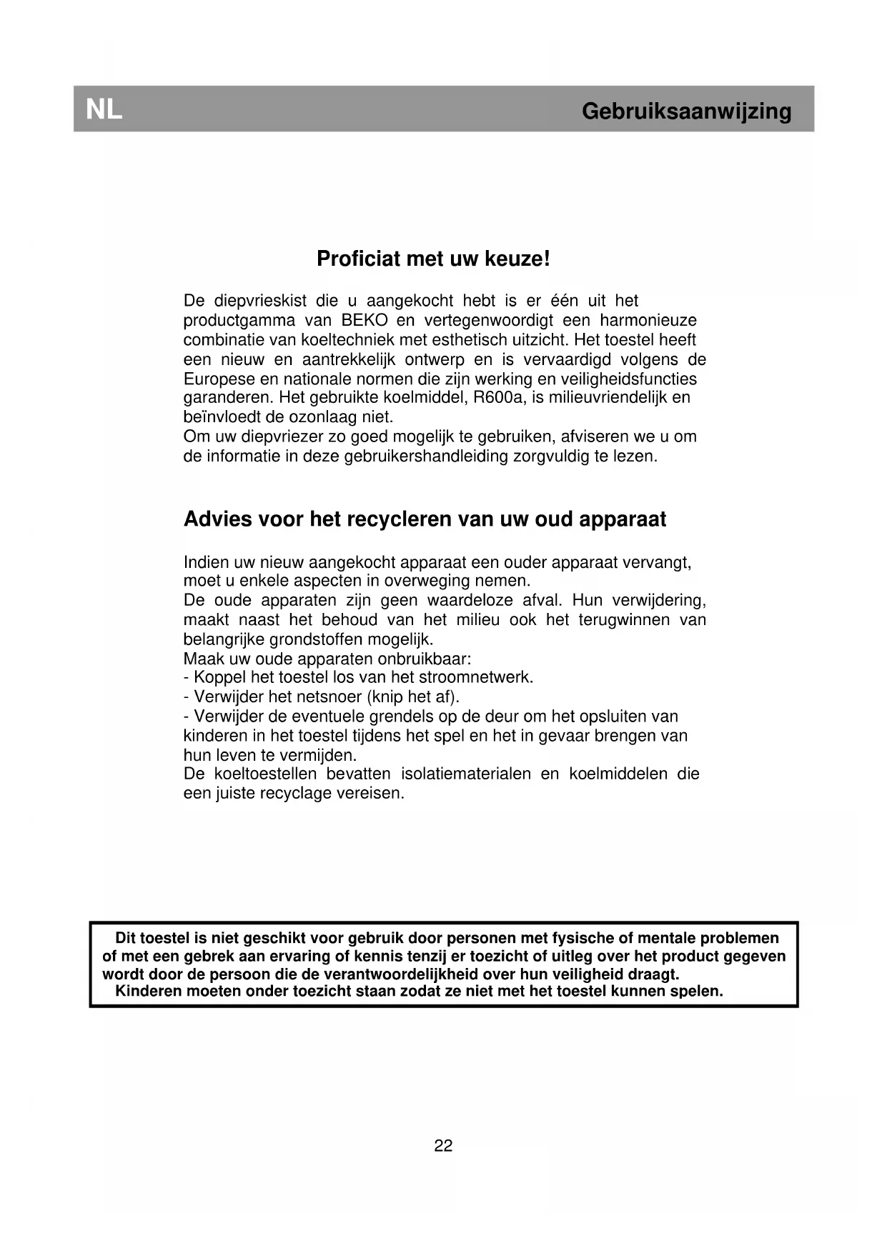 NL Gebruiksaanwijzing Dit toestel is niet geschikt voor gebruik door personen met fysische of mentale problemen of met een gebrek aan ervaring of kennis tenzij er toezicht of uitleg over het product gegeven wordt door de persoon die de verantwoordelijkheid over hun veiligheid draagt. Kinderen moeten onder toezicht staan zodat ze niet met het toestel kunnen spelen.Recycleren van de verpakking W A A R S C H U W I N G ! Laat kinderen niet met de verpakking of delen ervan spelen. Er bestaat een risico op verstikking met delen van golfkarton en met plastic folie. Om het toestel in een goede toestand tot bij u te krijgen, werd het beschermd door een geschikte verpakking. Alle materialen van de verpakking zijn compatibel met het milieu en recycleerbaar. Help ons de verpakking te recycleren om het milieu te beschermen. B E L A N G R I J K ! Voor u het apparaat in werking stelt, moet u deze instructies zorgvuldig en volledig lezen. Ze bevatten belangrijke informatie betreffende de installatie, het gebruik en het onderhoud van het apparaat. De fabrikant is niet verantwoordelijk indien de informatie in dit document niet in acht wordt genomen. Bewaar de instructies op een veilige plaats om ze indien nodig gemakkelijk te kunnen lezen. Ze kunnen vervolgens ook nuttig zijn voor een andere gebruiker. O P G E L E T ! Dit apparaat moet enkel worden gebruikt voor het doel waarvoor het bestemd is (huishoudelijk gebruik), in geschikte gebieden, ver weg van regen, vochtigheid of andere weersomstandigheden. Transportinstructies Dit apparaat moet zoveel mogelijk uitsluitend in de verticale positie worden getransporteerd. De verpakking moet tijdens het transport in perfecte conditie zijn. Indien het apparaat in de horizontale positie werd vervoerd (enkel volgens de markeringen op de verpakking), wordt geadviseerd dat voor het apparaat in werking wordt gesteld, men het best gedurende 4 uur laat staan om het koelcircuit te laten rusten. Het niet inachtnemen van deze instructies kan een defect van de motorcompressor veroorzaken en de garantie annuleren. Waarschuwingen en algemeen advies Steek de stekker van het apparaat niet in het stopcontact indien u een defect opmerkt. Reparaties mogen enkel worden uitgevoerd door bevoegd personeel. Verwijder de stekker uit het stopcontact in de volgende situaties: - wanneer u het apparaat volledig ontvriest; - wanneer u het apparaat reinigt. Om de stekker uit het stopcontact te verwijderen, trek aan de stekker en niet aan de kabel. Zorg dat er een minimum ruimte is tussen het apparaat en de muur waartegen het apparaat wordt geplaatst. Klim niet op het apparaat. Laat kinderen niet met het apparaat spelen of erin klimmen. Gebruik nooit elektrische toestellen binnenin de diepvriezer om te ontdooien. Gebruik het apparaat niet nabij verwarmingstoestellen, fornuizen of andere bronnen van warmte en vuur. Laat de diepvriezer niet langer open staan dan nodig om voedsel erin te plaatsen of eruit te halen. Laat geen voedsel in het apparaat indien het niet werkt. Plaats geen producten in het apparaat die ontvlambare of explosieve gassen bevatten. Plaats geen bruisende dranken (sap, mineraal water, champagne, enz.) in de diepvriezer: de fles kan ontploffen! Vries geen dranken in plastic flessen in. Eet geen ijsblokjes of roomijs onmiddellijk nadat u deze uit de diepvriezer hebt genomen omdat ze “vriesbrandwonden” kunnen veroorzaken. Raak nooit koude metalen delen of bevroren voedsel aan met natte handen omdat uw handen snel kunnen bevriezen op zeer koude oppervlakken. Ter bescherming van het toestel in de opslagplaats en tijdens het transport worden tussenstukken geleverd tussen de deur en kast (aan de voorkant- en achterkant). Deze tussenstukken worden verwijderd voor het toestel in gebruik wordt genomen.