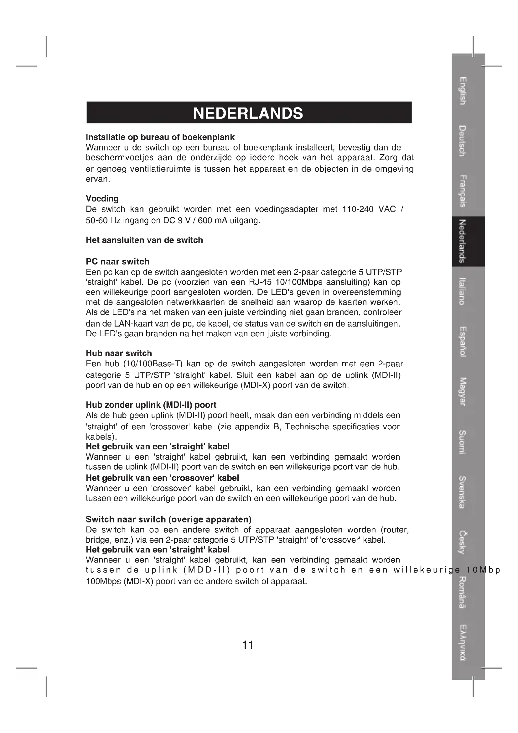 ATTENTION Afin de réduire les risques de chocs électriques, ce produit ne doit être ouvert QUE par un technicien qualifié agréé en cas de réparation. Débranchez l'appareil du secteur et des autres équipements en cas de problème. N'exposez jamais l'appareil à l'eau ou à l'humidité. Entretien : Ne nettoyez l'appareil qu'avec un chiffon sec. N'utilisez pas de solvants ou de produits abrasifs. Garantie : Aucune garantie ou responsabilité ne sera acceptée en cas de modification et/ou de transformation du produit ou en cas de dommages provoqués par une utilisation incorrecte de l'appareil. Généralités : Le design et les caractéristiques techniques sont sujets à modification sans notification préalable. Tous les logos de marques et noms de produits sont des marques déposées ou immatriculées dont les titulaires sont les propriétaires et sont donc reconnus comme telles dans ce document. Conservez ce manuel pour toute référence future. Attention : Ce symbole figure sur l'appareil. Il signifie que les produits électriques et électroniques ne doivent pas être jetés avec les ordures ménagères. Le système de collecte est différent pour ce genre de produits. Copyright ©11 NEDERLANDS Installatie op bureau of boekenplank Wanneer u de switch op een bureau of boekenplank installeert, bevestig dan de beschermvoetjes aan de onderzijde op iedere hoek van het apparaat. Zorg dat er genoeg ventilatieruimte is tussen het apparaat en de objecten in de omgeving ervan. Voeding De switch kan gebruikt worden met een voedingsadapter met 110-240 VAC / 50-60 Hz ingang en DC 9 V / 600 mA uitgang. Het aansluiten van de switch PC naar switch Een pc kan op de switch aangesloten worden met een 2-paar categorie 5 UTP/STP 'straight' kabel. De pc (voorzien van een RJ-45 10/100Mbps aansluiting) kan op een willekeurige poort aangesloten worden. De LED's geven in overeenstemming met de aangesloten netwerkkaarten de snelheid aan waarop de kaarten werken. Als de LED's na het maken van een juiste verbinding niet gaan branden, controleer dan de LAN-kaart van de pc, de kabel, de status van de switch en de aansluitingen. De LED's gaan branden na het maken van een juiste verbinding. Hub naar switch Een hub (10/100Base-T) kan op de switch aangesloten worden met een 2-paar categorie 5 UTP/STP 'straight' kabel. Sluit een kabel aan op de uplink (MDI-II) poort van de hub en op een willekeurige (MDI-X) poort van de switch. Hub zonder uplink (MDI-II) poort Als de hub geen uplink (MDI-II) poort heeft, maak dan een verbinding middels een 'straight' of een 'crossover' kabel (zie appendix B, Technische specificaties voor kabels). Het gebruik van een 'straight' kabel Wanneer u een 'straight' kabel gebruikt, kan een verbinding gemaakt worden tussen de uplink (MDI-II) poort van de switch en een willekeurige poort van de hub. Het gebruik van een 'crossover' kabel Wanneer u een 'crossover' kabel gebruikt, kan een verbinding gemaakt worden tussen een willekeurige poort van de switch en een willekeurige poort van de hub. Switch naar switch (overige apparaten) De switch kan op een andere switch of apparaat aangesloten worden (router, bridge, enz.) via een 2-paar categorie 5 UTP/STP 'straight' of 'crossover' kabel. Het gebruik van een 'straight' kabel Wanneer u een 'straight' kabel gebruikt, kan een verbinding gemaakt worden tussen de uplink (MDD-II) poort van de switch en een willekeurige 10Mbps of 100Mbps (MDI-X) poort van de andere switch of apparaat.12 Het gebruik van een 'crossover' kabel Wanneer u een 'crossover' kabel gebruikt, kan een verbinding gemaakt worden tussen een willekeurige (MDI-X) poort van de switch en een willekeurige 10Mbps of 100Mbps (MDI-X) poort van de andere switch of apparaat. NB: de eerste twisted-pair poort (poort 1x) wordt gedeeld met de uplink poort. Als u een hub op de uplink poort aansluit, gebruik dan poort 1x niet. Conformiteitsverklaring Wij, Nedis BV De Tweeling 28 5215 MC ’s-Hertogenbosch Nederland Tel.: 0031 73 599 1055 E-mail: info@nedis.com verklaren dat het product: Merknaam: König Electronic Model: CMP-EHUB15 Omschrijving: 5 poorten Ethernet switch in overeenstemming met de volgende normen is: EN55022: 1998+A1: 2000+A2: 2003 EN61000-3-2: 2000 EN61000-3-3: 1995+A1: 2001 EN55024: 1998+A1: 2001+A2: 2003 en voldoet aan de vereiste richtlijn 89/336/EEG van de Europese Unie. ‘s-Hertogenbosch, 31-03-09 Mevr. J. Gilad Directeur inkoop13 Veiligheidsvoorzorgsmaatregelen: GEVAAR VOOR ELEKTRISCHE SCHOK NIET OPENEN LET OP: Wanneer service of reparatie noodzakelijk is, mag dit product UITSLUITEND door een geautoriseerde technicus geopend worden; dit om de kans op het krijgen van een elektrische schok te voorkomen. Als er een probleem optreedt, koppel het product dan los van het lichtnet en van andere apparatuur. Stel het product niet bloot aan water of vocht. Onderhoud: Uitsluitend reinigen met een droge doek. Gebruik geen reinigingsmiddelen of schuurmiddelen. Garantie: Voor wijzigingen en veranderingen aan het product of schade veroorzaakt door een verkeerd gebruik van dit product, kan geen aansprakelijkheid worden geaccepteerd. Tevens vervalt daardoor de garantie. Algemeen: Wijziging van ontwerp en specificaties zonder voorafgaande mededeling onder voorbehoud. Alle logo's, merken en productnamen zijn handelsmerken of geregistreerde handelsmerken van de respectievelijke eigenaren en worden hierbij als zodanig erkend. Bewaar deze gebruiksaanwijzing voor later gebruik. Let op: Dit product is voorzien van dit symbool. Dit symbool geeft aan dat afgedankte elektrische en elektronische producten niet met het gewone huisafval verwijderd mogen worden. Voor dit soort producten zijn er speciale inzamelingspunten. Copyright ©14 ITALIANO Installazione su scrivania o ripiano Quando si installa lo switch su una scrivania o un ripiano, applicare questi piedini ammortizzatori sul fondo, ad ogni angolo del dispositivo. Lasciare lo spazio sufficiente per la ventilazione tra il dispositivo e gli oggetti a