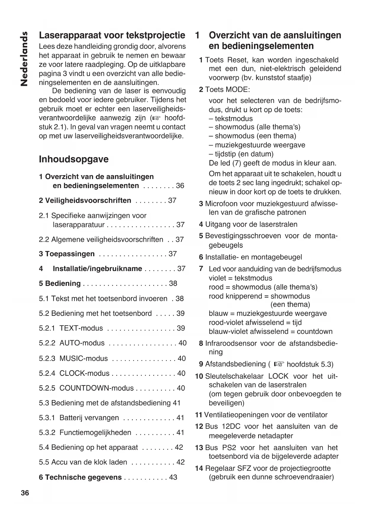 1 Overzicht van de aansluitingen en bedieningselementen 36