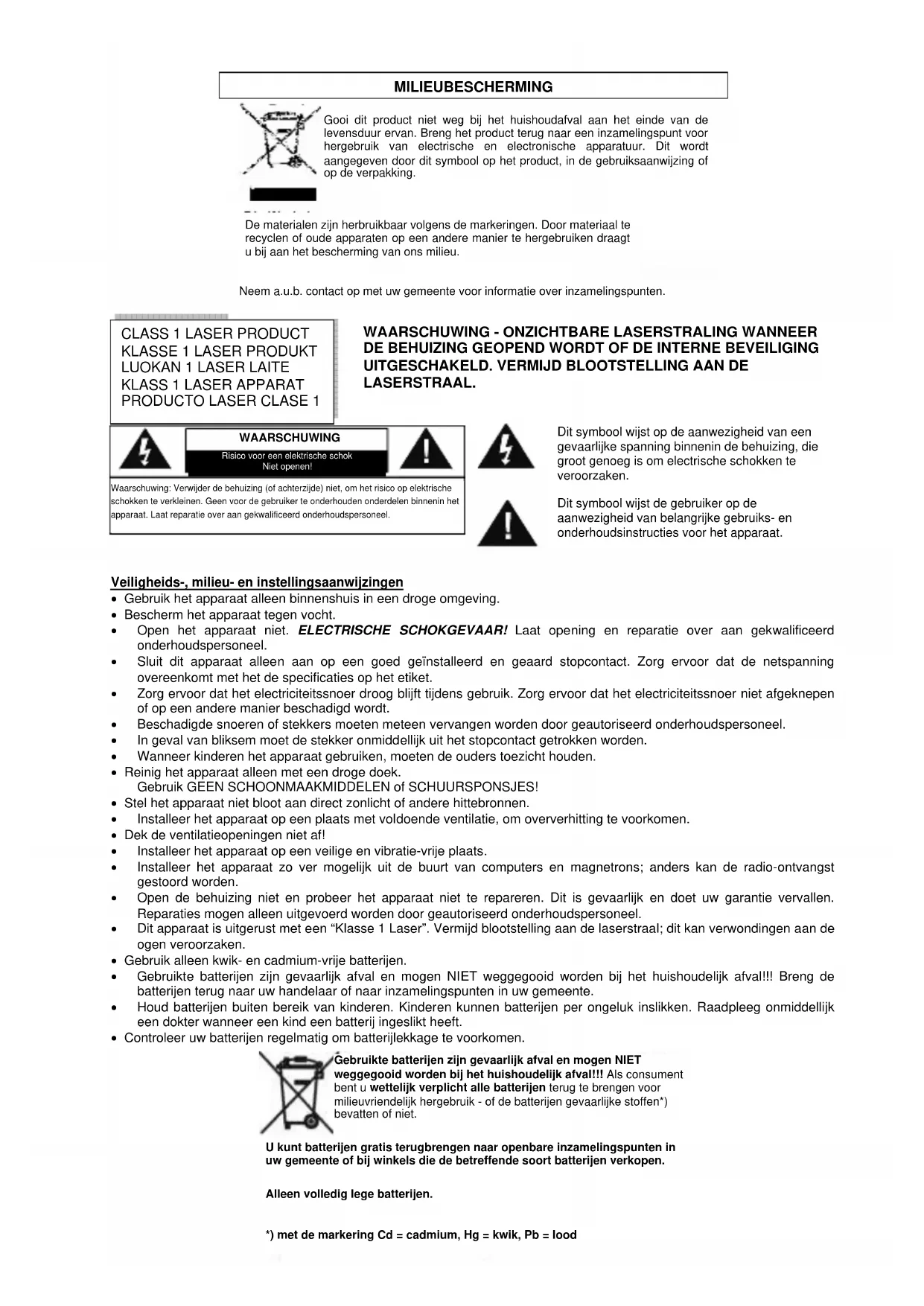Gebruekte batterijen zijn gevaarlijk afval en mogen NIET weggegoed worden bij het huishoudelijk afval!!! Als consument bent u wettelijk verplicht alle batterijen terug te brengen voor milieuvriendelijk hergebruik - of de batterijen gevaarlijke stoff*) bevatten of Niet.