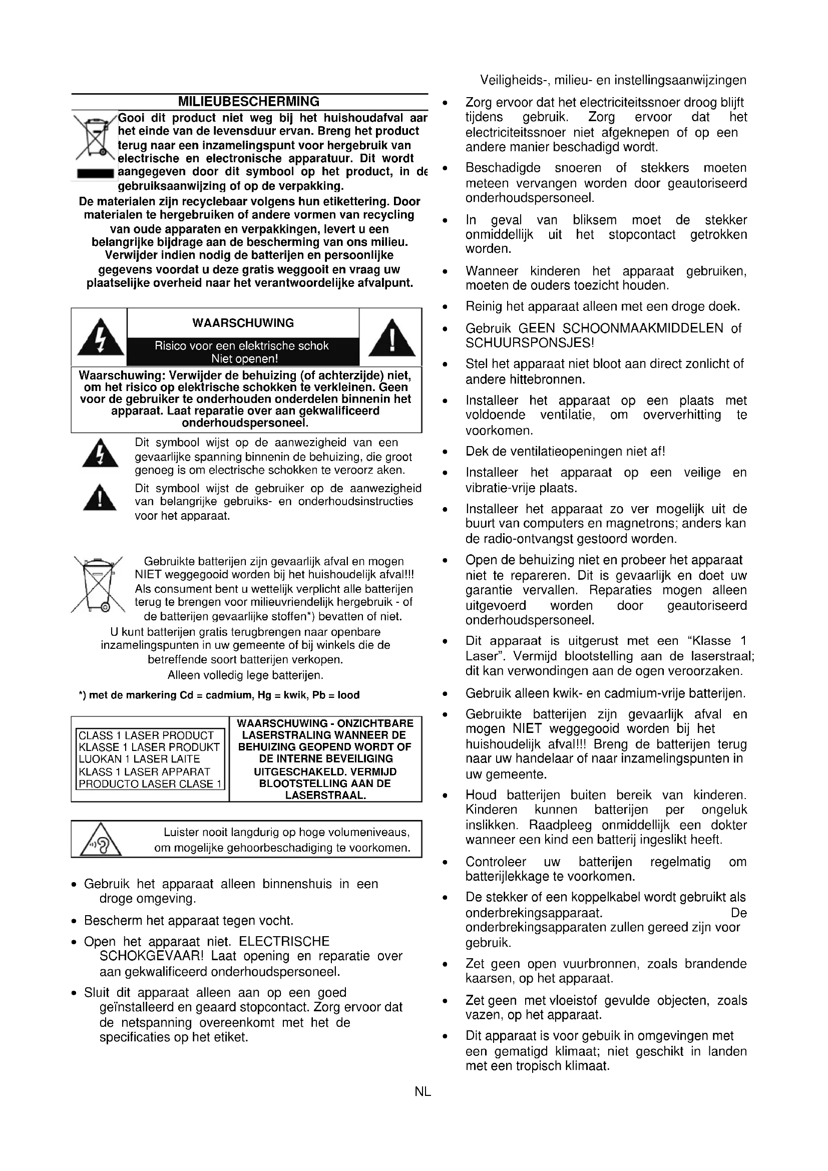 - Gebruik alleen kwik- en cadmium-vrije batterijen.