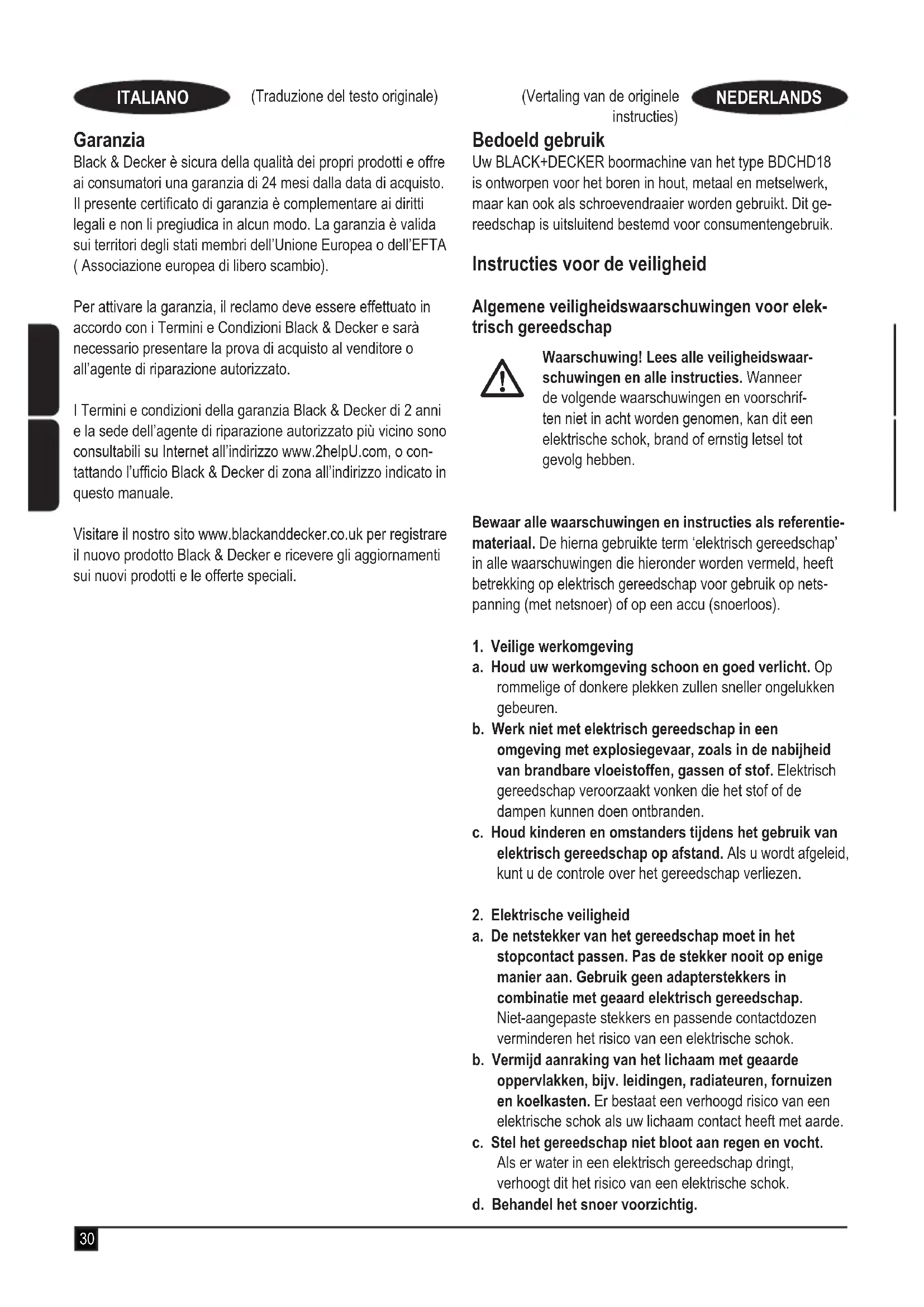 %37 (Vertaling van de originele instructies) NEDERLANDS (Traducción de las instrucciones originales) ESPAÑOL BDCDC18-boormachine/schroevendraaier Black & Decker verklaart dat deze producten, beschreven bij ‘Technische gegevens’, voldoen aan: 2006/42/EG, EN 60745-1, EN 60745-2-1 Deze producten voldoen tevens aan richtlijn 2004/108/EG (tot 19/04/2016) 2014/30/EU (vanaf 20/04/2016) en 2011/65/EU. Neem voor meer informatie contact op met Black & Decker op het volgende adres of raadpleeg de achterzijde van de handleiding. De ondergetekende is verantwoordelijk voor de samenstel- ling van het technische bestand en legt deze verklaring af namens. Black & Decker. R. Laverick Engineering Manager Black & Decker Europe, 210 Bath Road, Slough, Berkshire, SL1 3YD Verenigd Koninkrijk 18-11-2015 Garantie Black & Decker heeft vertrouwen in zijn producten en biedt consumenten een garantie van 24 maanden vanaf de aankoopdatum. Deze garantie vormt een aanvulling op uw wettelijke rechten en beperken deze niet. De garantie is geldig op het grondgebied van de Lidstaten van de Europese Unie en de Europese Vrijhandelszone. Voor een garantie-aanspraak moet uw aanspraak in ove- reenstemming zijn met de Voorwaarden en Condities van Black&Decker en moet u een bewijs van aankoop overleggen aan de verkoper of aan een geautoriseerde reparatiemonteur. Voorwaarden en condities van de 2-jarige garantie van Black&Decker en het adres van de vestiging van het geauto- riseerde reparatiecentrum bij u in de buurt, kunt u vinden op internet op www.2helpU.com, of door contact op te nemen met het Black & Decker-kantoor ter plaatse, op het adres dat in deze handleiding wordt vermeld. Bezoek onze website www.blackanddecker.nl, waar u uw nieuwe Black & Decker-product kunt registreren en informatie kunt verkrijgen over nieuwe producten en speciale aanbied- ingen. Uso previsto El taladro BLACK+DECKER BDCHD18 ha sido diseñado para aplicaciones de atornillado y de taladrado de madera, metales y plásticos. Esta herramienta ha sido concebida únicamente para uso doméstico. Instrucciones de seguridad Advertencias de seguridad generales para herrami- entas eléctricas