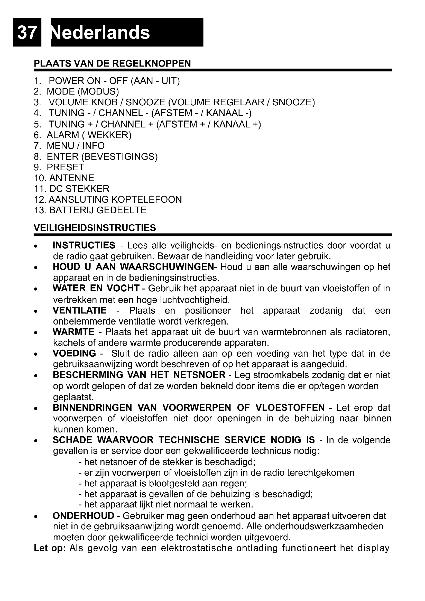 VEILIGHEIDSINSTRUCTIES INSTRUCTIES - Lees alle veiligheids- en bedieningsinstructies door voordat u de radio gaat gebruiken. Bewaar de handleiding voor later gebruik. HOUD U AAN WAARSCHUWINGEN- Houd u aan alle waarschuwingen op het apparaat en in de bedieningsinstructies. WATER EN VOCHT - Gebruik het apparaat niet in de buurt van vloeistoffen of in vertrekken met een hoge luchtvochtigheid. VENTILATIE - Plaats en positioneer het apparaat zodanig dat een onbelemmerde ventilatie wordt verkregen. WARMTE - Plaats het apparaat uit de buurt van warmtebronnen als radiatoren, kachels of andere warmte producerende apparaten. VOEDING - Sluit de radio alleen aan op een voeding van het type dat in de gebruiksaanwijzing wordt beschreven of op het apparaat is aangeduid. BESCHERMING VAN HET NETSNOER - Leg stroomkabels zodanig dat er niet op wordt gelopen of dat ze worden bekneld door items die er op/tegen worden geplaatst. BINNENDRINGEN VAN VOORWERPEN OF VLOESTOFFEN - Let erop dat voorwerpen of vloeistoffen niet door openingen in de behuizing naar binnen kunnen komen. SCHADE WAARVOOR TECHNISCHE SERVICE NODIG IS - In de volgende gevallen is er service door een gekwalificeerde technicus nodig: - het netsnoer of de stekker is beschadigd; - er zijn voorwerpen of vloeistoffen zijn in de radio terechtgekomen - het apparaat is blootgesteld aan regen; - het apparaat is gevallen of de behuizing is beschadigd; - het apparaat lijkt niet normaal te werken. ONDERHOUD - Gebruiker mag geen onderhoud aan het apparaat uitvoeren dat niet in de gebruiksaanwijzing wordt genoemd. Alle onderhoudswerkzaamheden moeten door gekwalificeerde technici worden uitgevoerd. Let op: Als gevolg van een elektrostatische ontlading functioneert het display38 Nederlands mogelijk dat niet correct of reageert het apparaat niet op de bedieningsknoppen. Schakel het apparaat dan uit, koppel het los en verwijder alle batterijen en sluit het na enkele seconden opnieuw aan. STROOMBRONNEN WISSELSTROOM: u sluit uw draagbare stereosysteem op de stroom aan door het netsnoer aan het DC stekker (11) aan de achterkant van het apparaat aan te brengen en de stekker in een stopcontact in de muur te steken. Controleer of de nominale spanning van uw apparaat overeenkomt met uw lokale voltage. Zorg ervoor dat het netsnoer volledig in het apparaat is aangebracht. BATTERIJSTROOM: om de radio met batterijen te gebruiken, haalt u de stekker uit het stopcontact en plaatst u 4 × "LR6" -batterijen in het vakje (13). Controleer, ter voorkoming van schade aan het apparaat, of de batterijen correct zijn geplaatst.Verwijder de batterijen als de radio gedurende langere tijd niet wordt gebruikt. Dit ter voorkoming van lekkage van de batterijen en schade aan de radio.