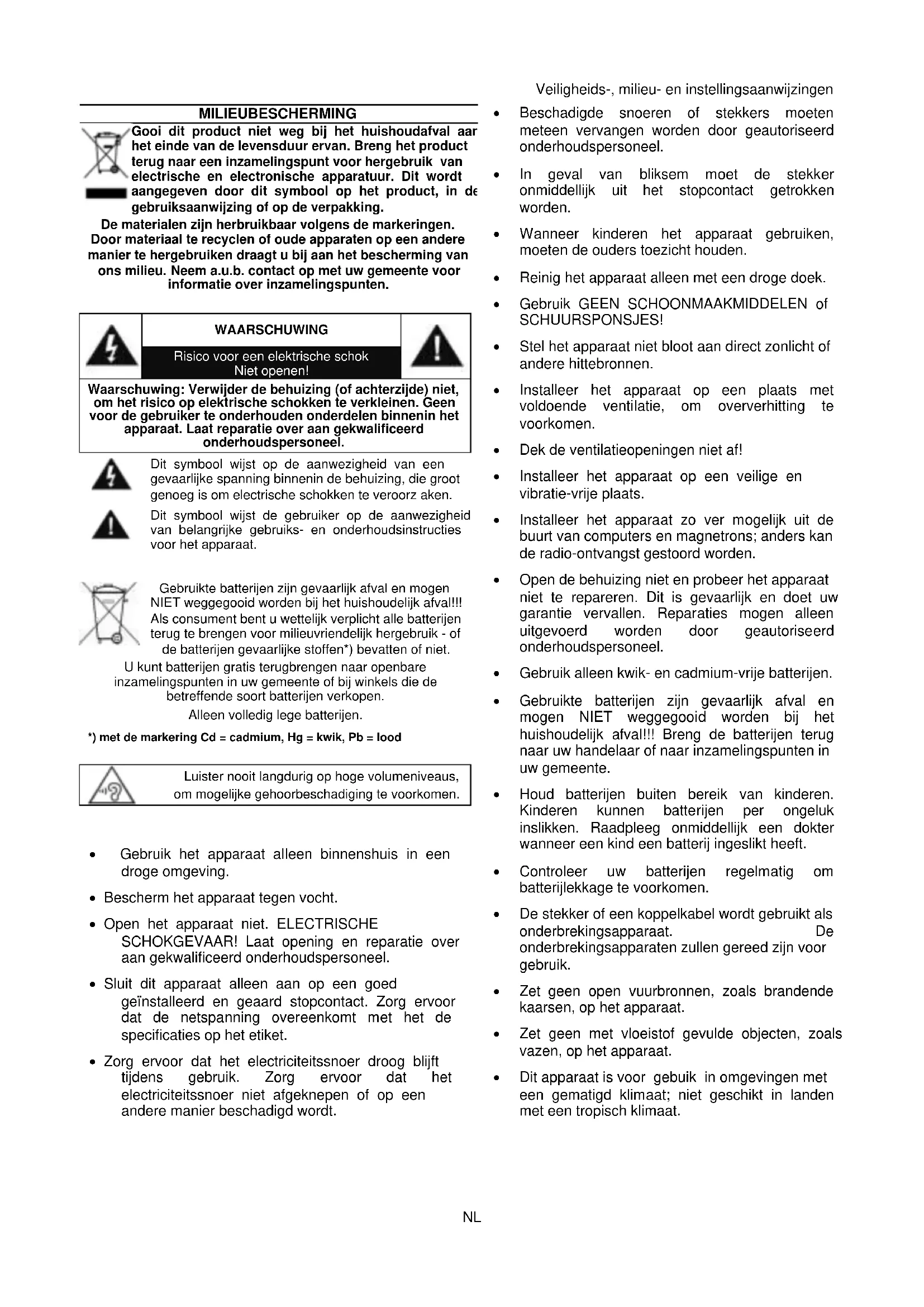 - Gebruik alleen kwik- en cadmium-vrije batterijen.