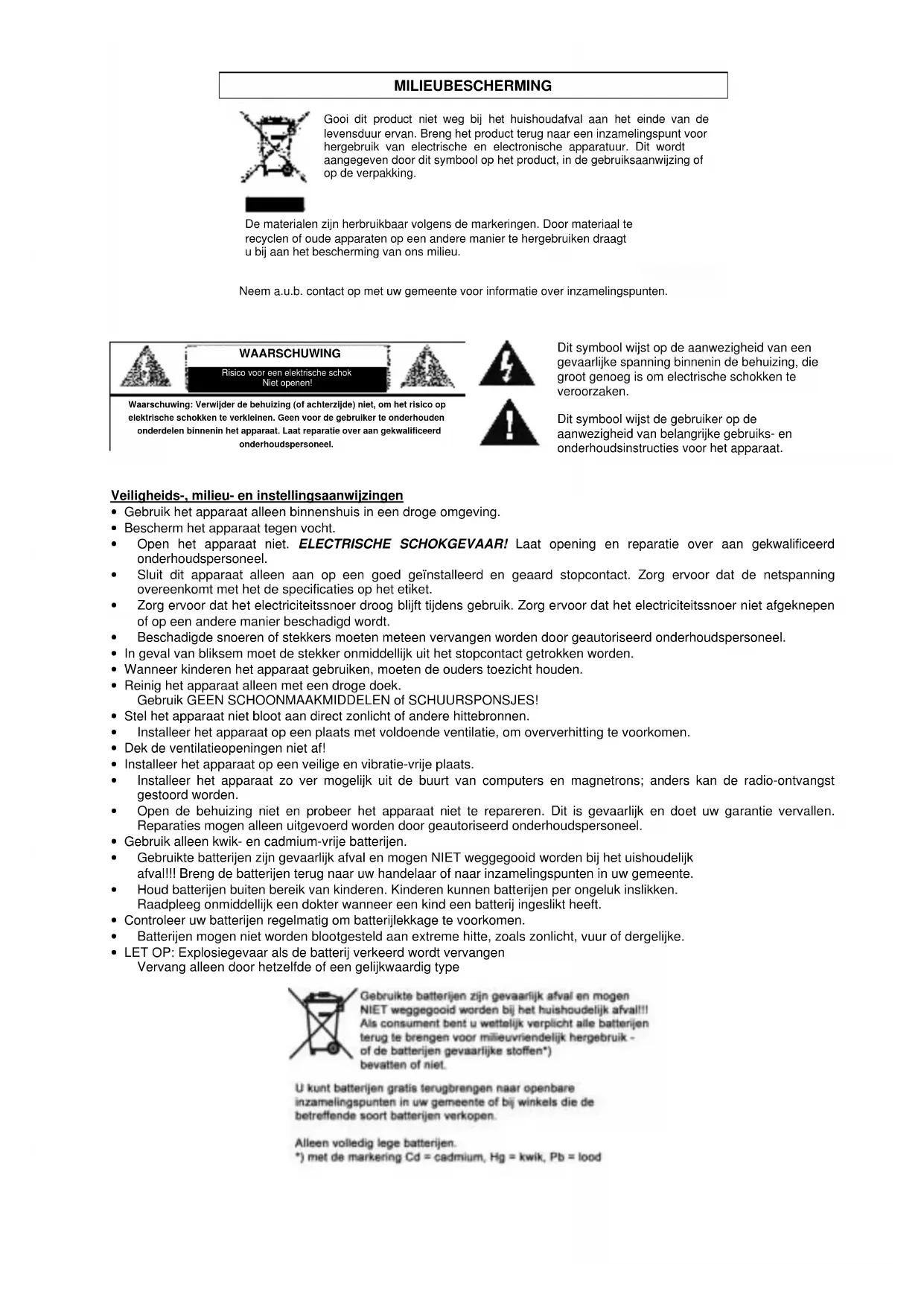 - Gebruik alleen kwik- en cadmium-vrije batterijen.