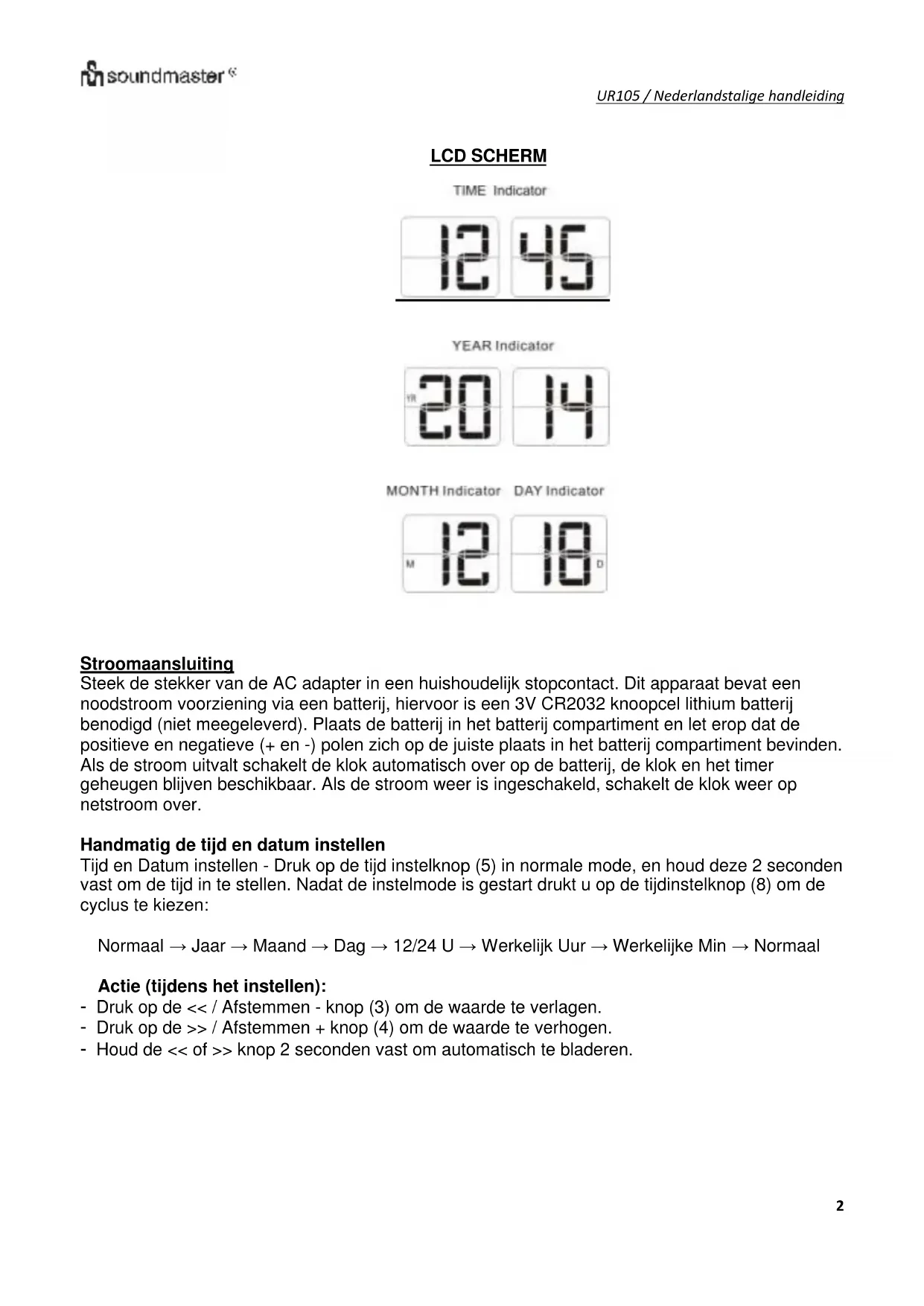- Jaar → Maand → Dag → 12/24 U → Werkelijk Uur → Werkelijke Min → Normaal Actie (tijdens het instellen): - Druk op de << / Afstemmen - knop (3) om de waarde te verlagen. - Druk op de >> / Afstemmen + knop (4) om de waarde te verhogen. - Houd de << of >> knop 2 seconden vast om automatisch te bladeren.UR105 / Nederlandstalige handleiding