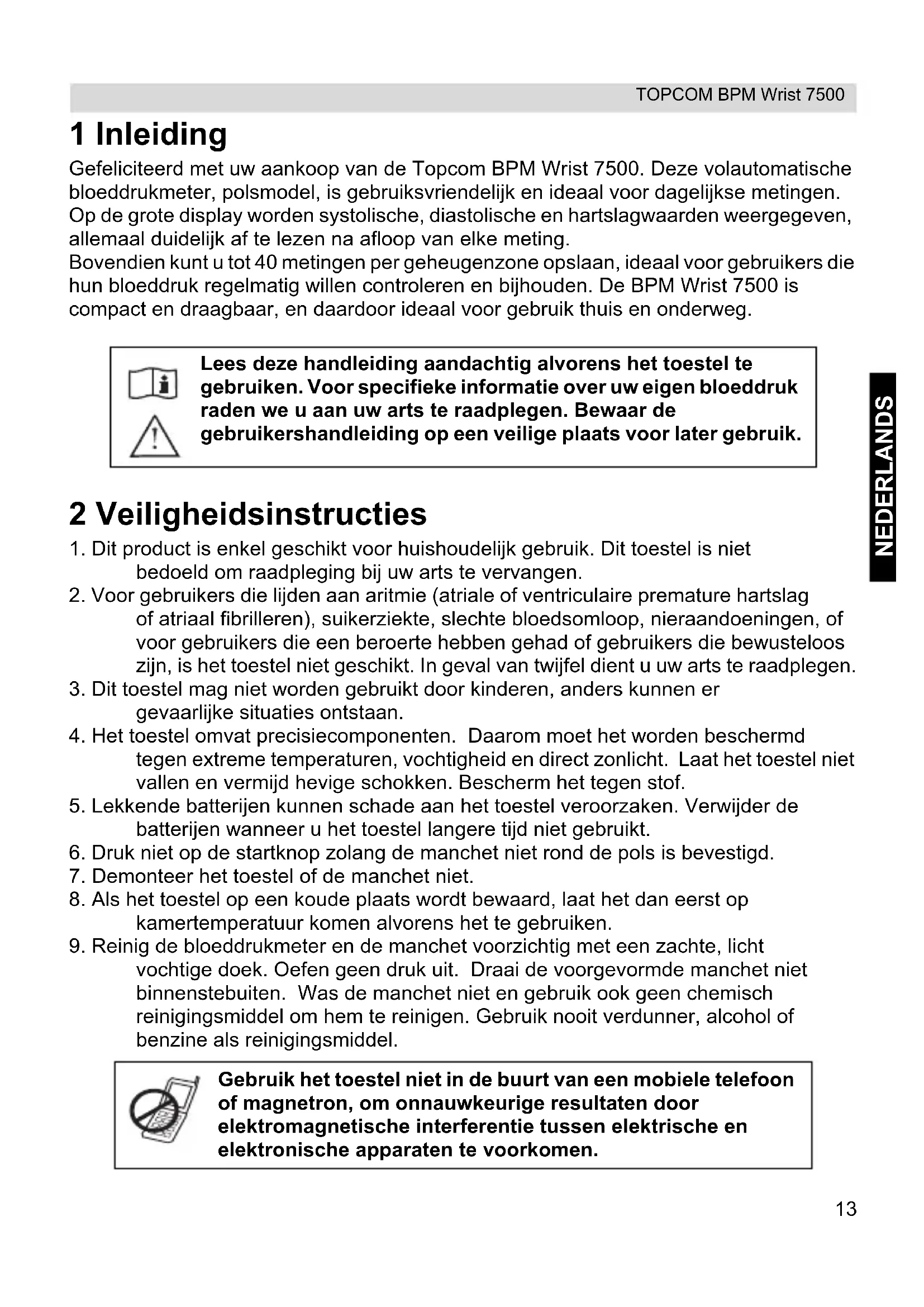 Damage or defects caused by incorrect treatment or operation and damage resulting from use of non-original parts or accessories are not covered by the warranty. The warranty does not cover damage caused by outside factors, such as lightning, water and fire, nor any damage caused during transportation. No warranty can be claimed if the serial number on the units has been changed, removed or rendered illegible. Any warranty claims will be invalid if the unit has been repaired, altered or modified by the buyer.13 TOPCOM BPM Wrist 7500 NEDERLANDS 1 Inleiding Gefeliciteerd met uw aankoop van de Topcom BPM Wrist 7500. Deze volautomatische bloeddrukmeter, polsmodel, is gebruiksvriendelijk en ideaal voor dagelijkse metingen. Op de grote display worden systolische, diastolische en hartslagwaarden weergegeven, allemaal duidelijk af te lezen na afloop van elke meting. Bovendien kunt u tot 40 metingen per geheugenzone opslaan, ideaal voor gebruikers die hun bloeddruk regelmatig willen controleren en bijhouden. De BPM Wrist 7500 is compact en draagbaar, en daardoor ideaal voor gebruik thuis en onderweg. 2 Veiligheidsinstructies
