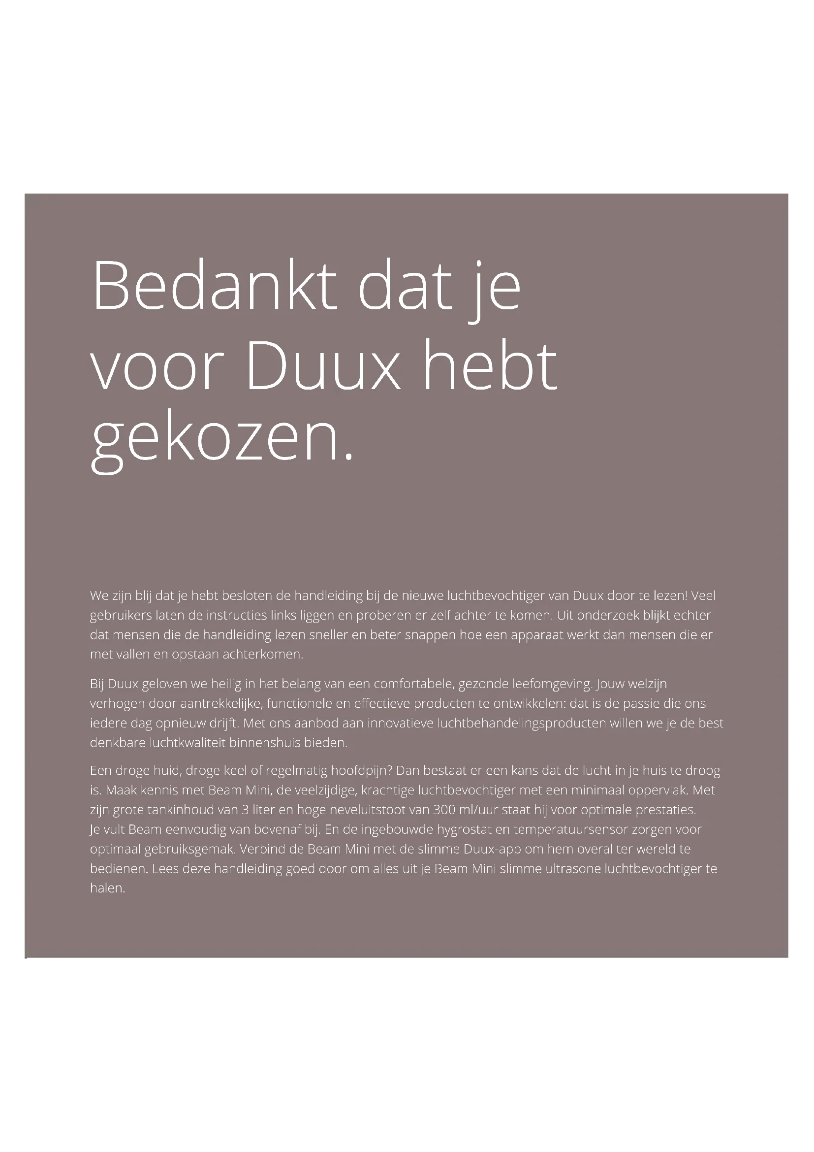 Disposal The European directive 2012 / 19 / CE on Waste Electrical and Electronic Equipment (WEEE), requires that old household electrical appliances must not be disposed in the normal unsorted municipal waste stream. Old appli-ances must be collected separately in order to optimize the recovery and recycling of the materials they contain and reduce the impact on human health and the environment. The crossed out “wheeled bin” symbol on the product reminds you of your obligation, that when you dispose of the appliance it must be separately collected. Consumers should contact their local authority or retailer for information concerning the correct disposal of their old appliance. Simplied EU declaration of conformity Hereby, Duux declares that this environmental control radio equipment is in compliance with Directive 2014/53/EU. The full text of the EU Declaration of Conformity is available at the following internet address: www.duux.com/doc ENBedankt dat je voor Duux hebt gekozen. We zijn blij dat je hebt besloten de handleiding bij de nieuwe luchtbevochtiger van Duux door te lezen! Veel gebruikers laten de instructies links liggen en proberen er zelf achter te komen. Uit onderzoek blijkt echter dat mensen die de handleiding lezen sneller en beter snappen hoe een apparaat werkt dan mensen die er met vallen en opstaan achterkomen. Bij Duux geloven we heilig in het belang van een comfortabele, gezonde leefomgeving. Jouw welzijn verhogen door aantrekkelijke, functionele en eectieve producten te ontwikkelen: dat is de passie die ons iedere dag opnieuw drijft. Met ons aanbod aan innovatieve luchtbehandelingsproducten willen we je de best denkbare luchtkwaliteit binnenshuis bieden. Een droge huid, droge keel of regelmatig hoofdpijn? Dan bestaat er een kans dat de lucht in je huis te droog is. Maak kennis met Beam Mini, de veelzijdige, krachtige luchtbevochtiger met een minimaal oppervlak. Met zijn grote tankinhoud van 3 liter en hoge neveluitstoot van 300 ml/uur staat hij voor optimale prestaties. Je vult Beam eenvoudig van bovenaf bij. En de ingebouwde hygrostat en temperatuursensor zorgen voor optimaal gebruiksgemak. Verbind de Beam Mini met de slimme Duux-app om hem overal ter wereld te bedienen. Lees deze handleiding goed door om alles uit je Beam Mini slimme ultrasone luchtbevochtiger te halen.19 Inhouds- opgave