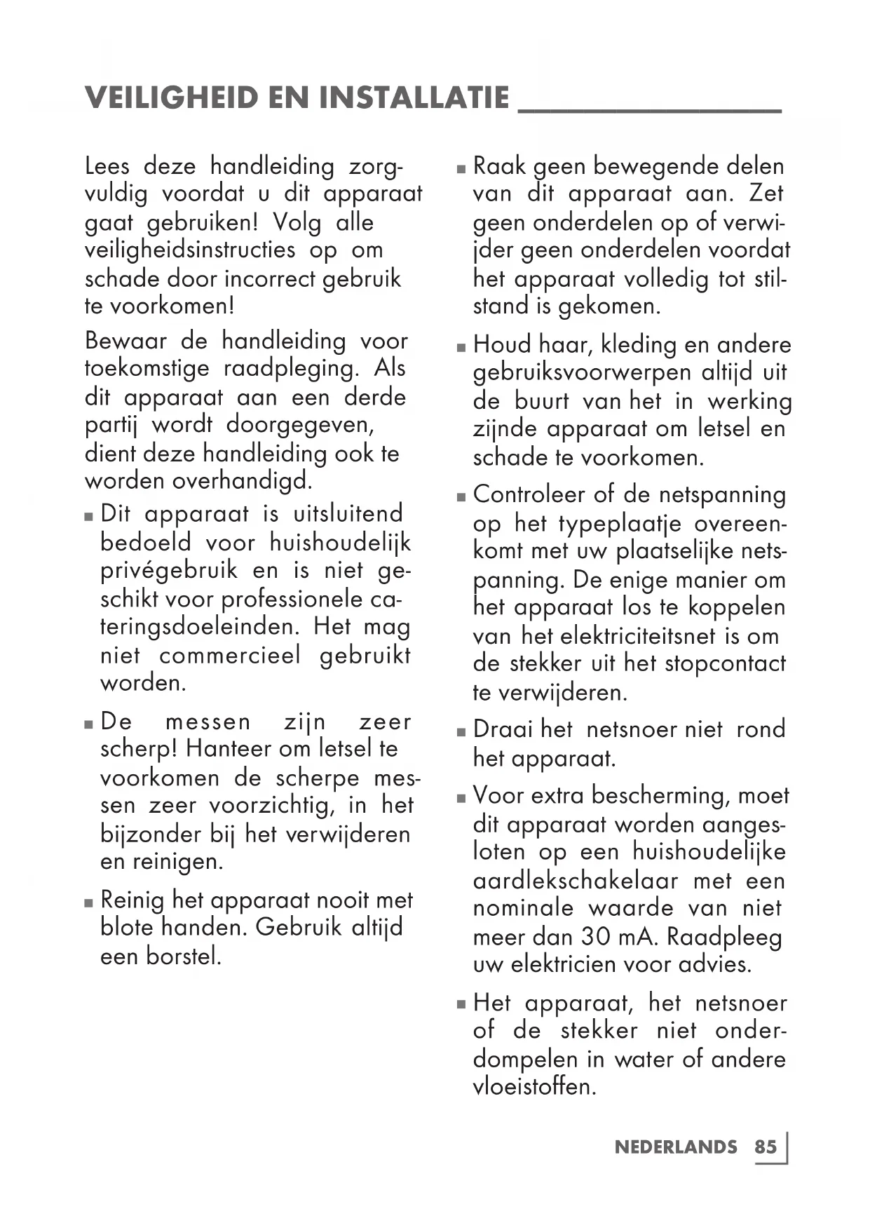 Schakel het apparaat voor het verwerken van voedsel nooit langer in dan nodig.88 NEDERL ANDS