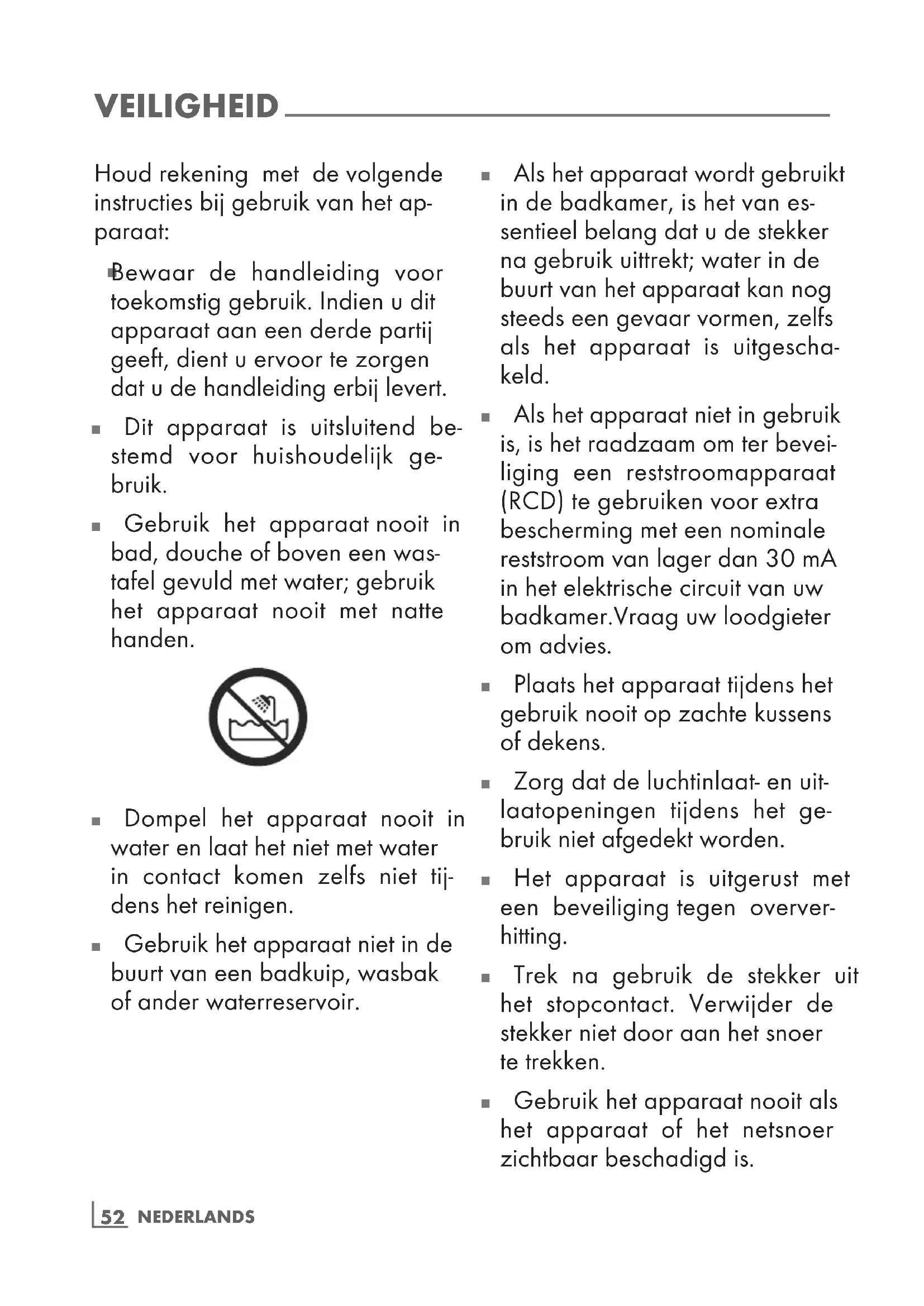 Gebruik het apparaat nooit in bad, douche of boven een was- tafel gevuld met water; gebruik het apparaat nooit met natte handen.