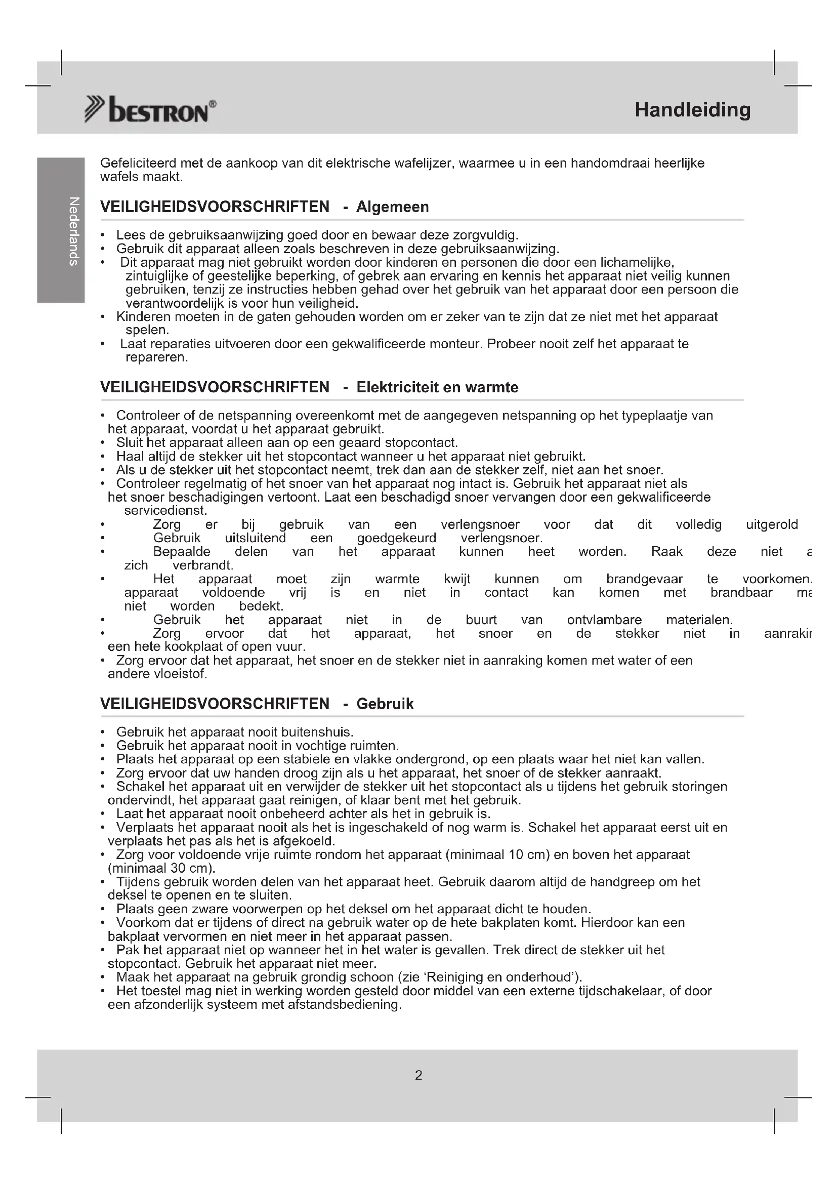 Nederlands Gefeliciteerd met de aankoop van dit elektrische wafelijzer, waarmee u in een handomdraai heerlijke wafels maakt. VEILIGHEIDSVOORSCHRIFTEN - Algemeen