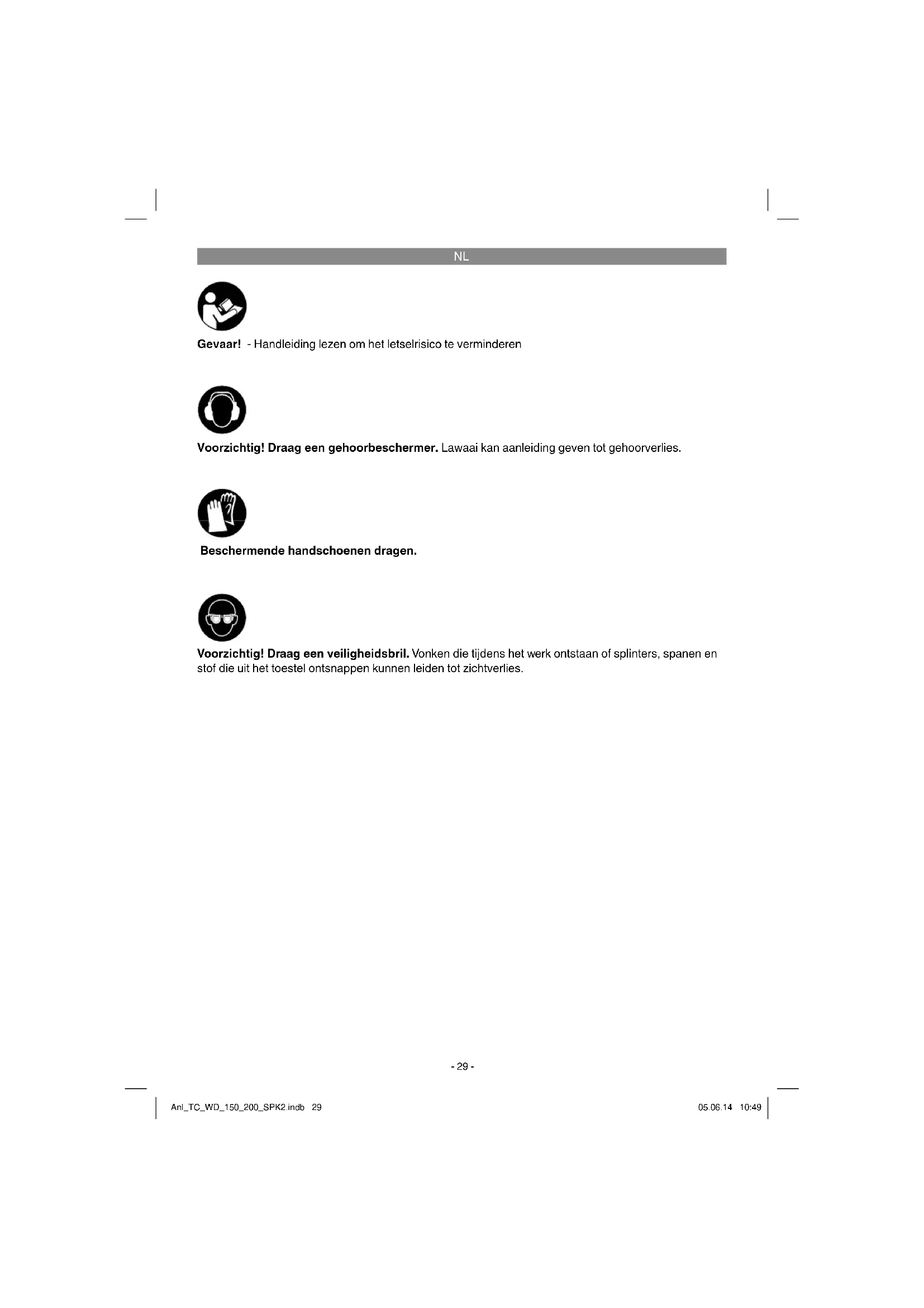 Gevaar! - Handleiding lezen om het letselrisico te verminderen Voorzichtig! Draag een gehoorbeschermer. Lawaai kan aanleiding geven tot gehoorverlies. Voorzichtig! Draag een veiligheidsbril. Vonken die tijdens het werk ontstaan of splinters, spanen en stof die uit het toestel ontsnappen kunnen leiden tot zichtverlies. Beschermende handschoenen dragen. Anl_TC_WD_150_200_SPK2.indb 29Anl_TC_WD_150_200_SPK2.indb 29 05.06.14 10:4905.06.14 10:49NL
