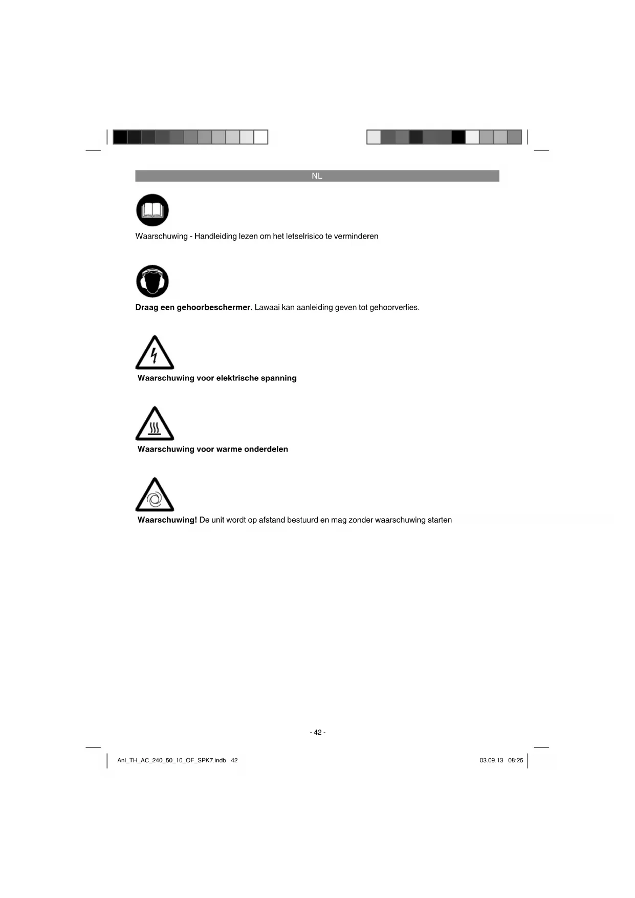 Waarschuwing voor elektrische spanning Waarschuwing voor warme onderdelen Waarschuwing! De unit wordt op afstand bestuurd en mag zonder waarschuwing starten Draag een gehoorbeschermer. Lawaai kan aanleiding geven tot gehoorverlies. Waarschuwing - Handleiding lezen om het letselrisico te verminderen Anl_TH_AC_240_50_10_OF_SPK7.indb 42Anl_TH_AC_240_50_10_OF_SPK7.indb 42 03.09.13 08:2503.09.13 08:25NL