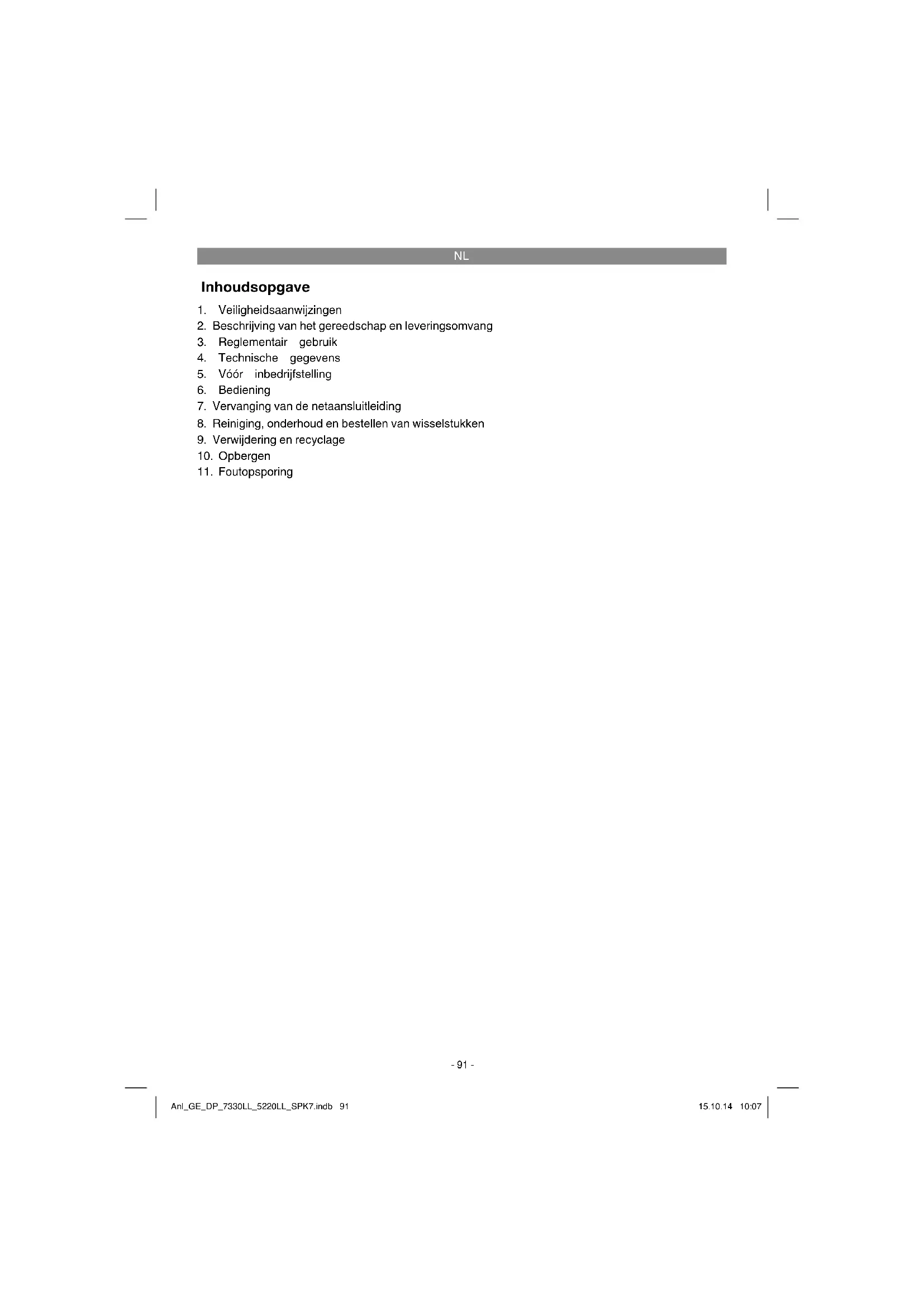 Het door uw aangekochte toestel is bedoeld voor het opvoeren van water met een maximale tem- peratuur van 35°C. Het toestel mag niet worden gebruikt voor andere vloeistoff en, vooral niet voor motorbrandstoff en, reinigingsmiddelen en andere chemische producten! Ga na of er eventueel speciale voorwaarden voor de installatie gelden, voordat u de pomp in bedrijf stelt! Wanneer bijv. door stroomonderbreking, vervui- ling of defecte afdichting materiële schade kan worden veroorzaakt, dan moeten extra veiligheid- sinrichtingen worden geïnstalleerd. Deze veiligheidsmaatregelen zijn bijvoorbeeld: parallel lopende pompen op een door een aparte zekering beveiligde stroomkring, vochtigheids- sensoren voor de uitschakeling en gelijkaardige veiligheidsinrichtingen. Laat u in geval van twijfel absoluut adviseren door een vakman voor sanitaire installaties. Het toestel wordt overal toegepast waar water van de ene plaats naar de andere moet worden overgebracht, b.v. in de huishouding, in de tuin en bij vele andere toepassingen. Het mag niet voor zwembassins worden gebruikt! Bij gebruik van het toestel in wateren met een natuurlijke modderige bodem plaatst u het toestel lichtjes verhoogd, b.v. op bakstenen. Het toestel is niet bedoeld om continu te worden gebruikt, b.v. als circulatiepomp in een vijver. De te verwachten levensduur van het toestel wordt daardoor aanzienlijk verkort omdat het toestel niet geconstrueerd is om permanent te worden belast. Het toestel mag slechts voor werkzaamheden worden gebruikt waarvoor het bedoeld is. Elk ver- der gaand gebruik is niet doelmatig. Voor daaruit voortvloeiende schade of letsel van welke aard dan ook is de gebruiker/bediener, niet de fabri- kant, aansprakelijk. Wij wijzen erop dat onze toestellen overeen- komstig hun bestemming niet ontworpen zijn voor commercieel, ambachtelijk of industrieel gebruik. Wij zijn niet aansprakelijk indien het toestel in ambachtelijke of industriële bedrijven alsmede bij gelijk te stellen activiteiten wordt gebruikt. Door uitlopen van smeerolie/smeermiddelen kan het water worden verontreinigd. Anl_GE_DP_7330LL_5220LL_SPK7.indb 94Anl_GE_DP_7330LL_5220LL_SPK7.indb 94 15.10.14 10:0715.10.14 10:07NL